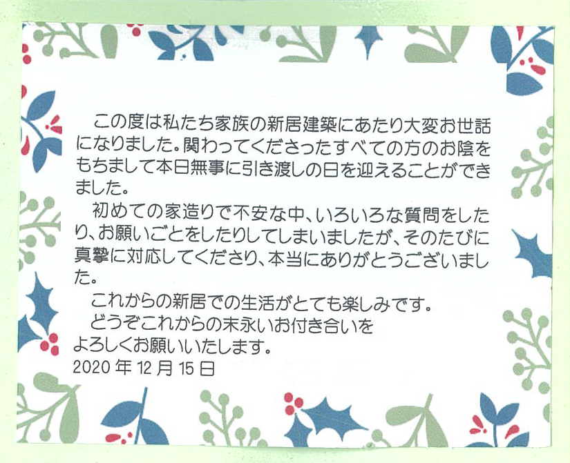 嬉しいお手紙を頂きましたDate:2021年1月22日 / Category:ブログ 先日お引渡しをさせていただいたお客様より、嬉しいお手紙を頂戴しました。 家づくりのお手伝いをさせていただく中で、やはり一番嬉しい瞬間はお客様にお喜びいただいた瞬間です。 これからも多くのお客様に笑顔をお届けできるよう精進してまいります。 共有:TwitterFacebook 記事一覧 « 前の記事 次の記事 »