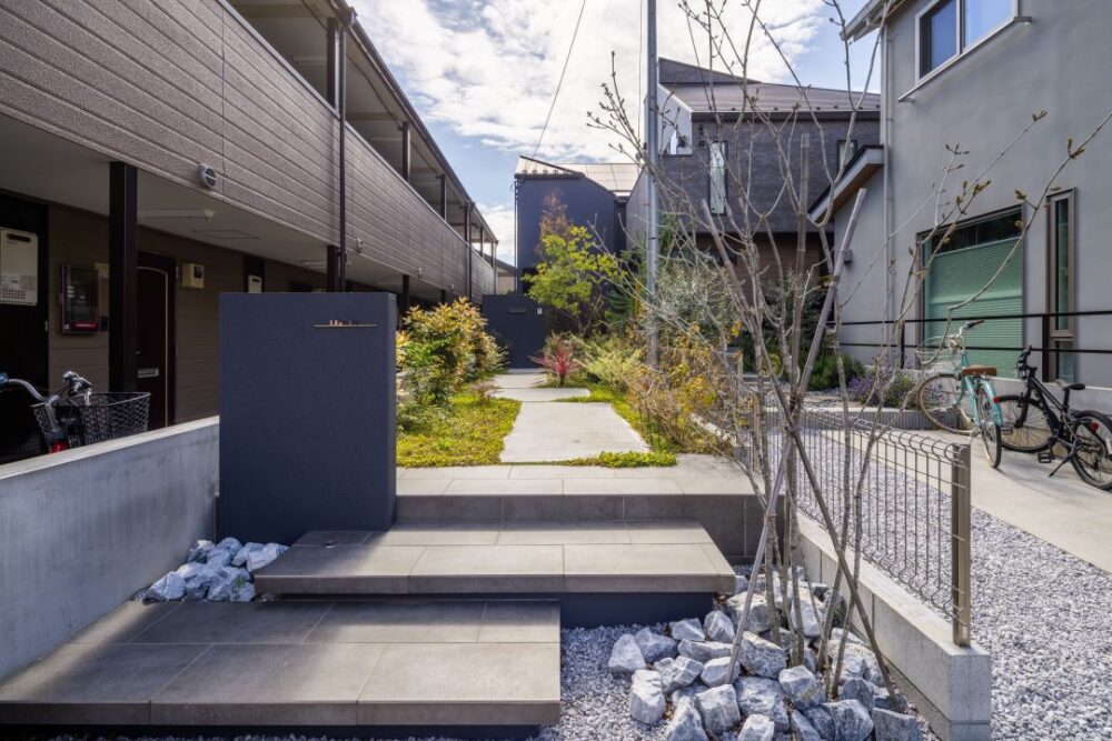 黒い外壁が印象的なO様邸。旗竿地の奥という立地を逆手に取り、奥行きのある外構計画で個性と機能を両立させています。■ 玄関アプローチ