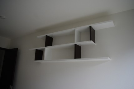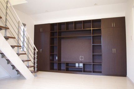 造り付けの壁面収納やドアのダーク色のコントラストが