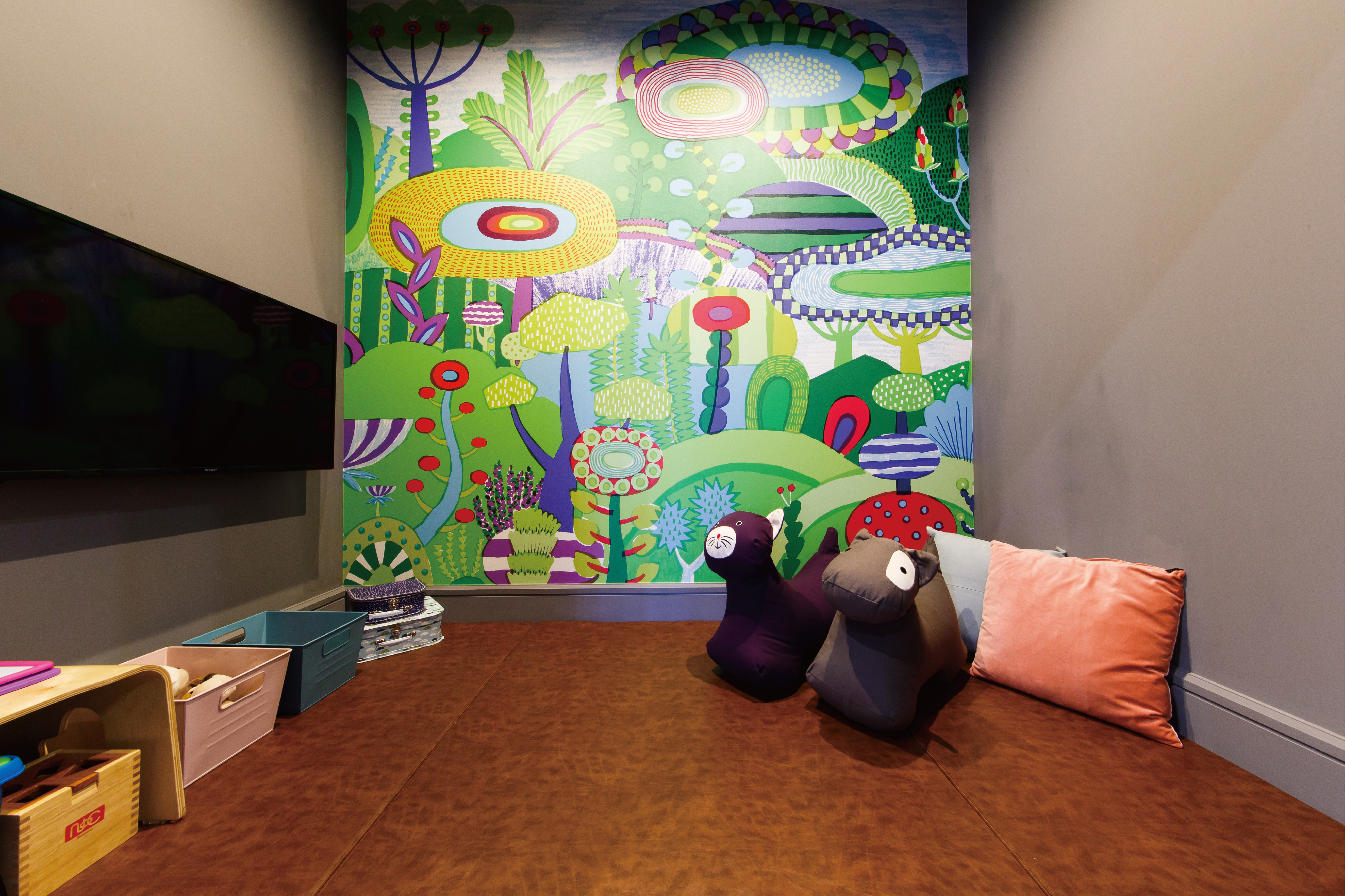 お子様向けのキッズルームも充実しており、壁面はこのようにペンでそのまま絵や文字がかけてしまう仕様になっております。