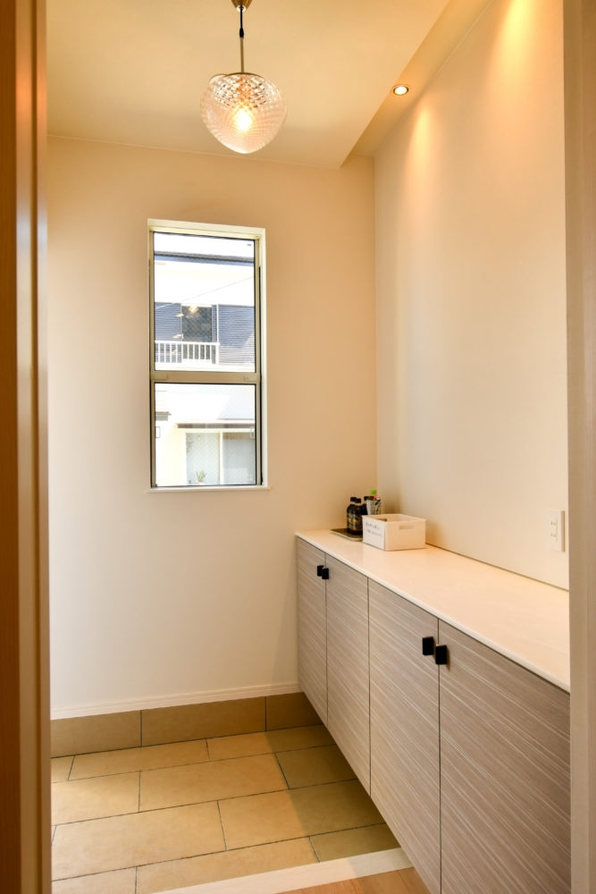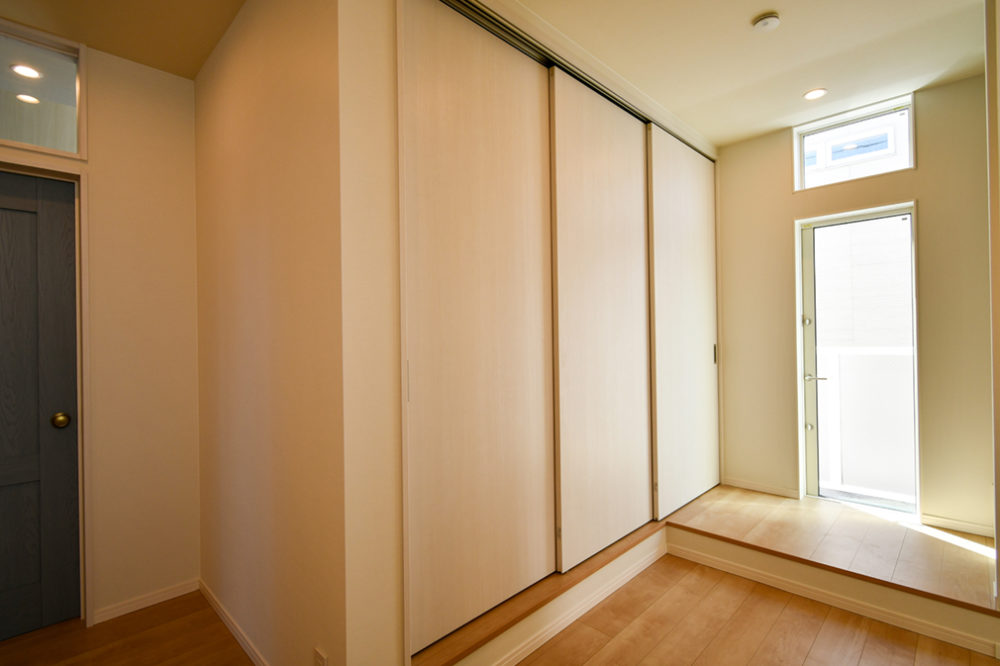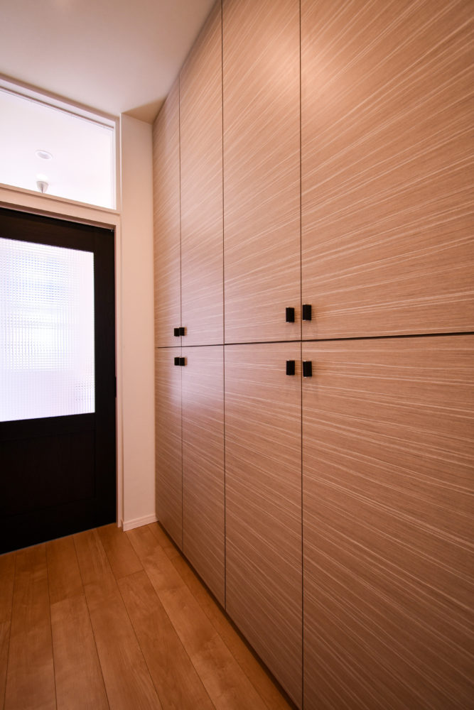 まずは、こちらの玄関です。天井高の高い1Fエリアの入口には、玄関から入ってすぐ左手に造作の収納コーナーを設けました。