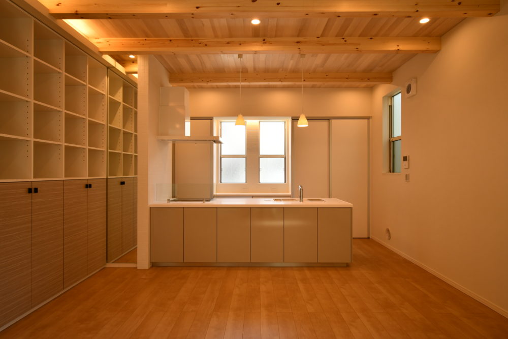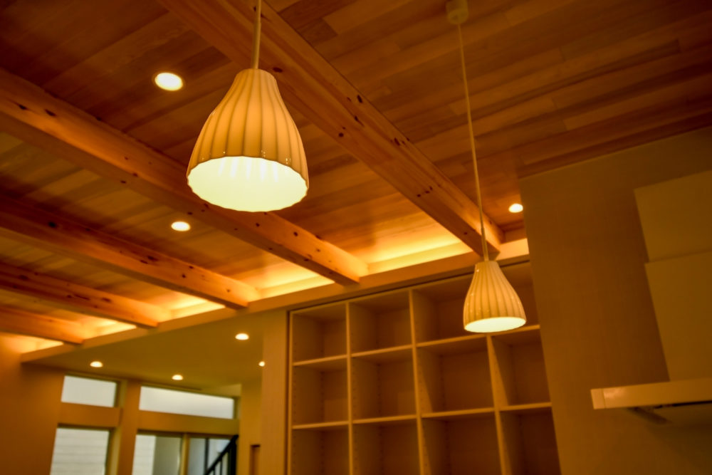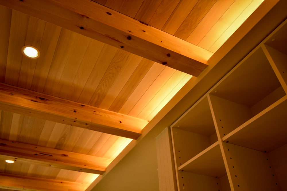 天井には梁をあらわしにし、下から照明が照らすことにより部屋全体に暖かな印象を与えます。