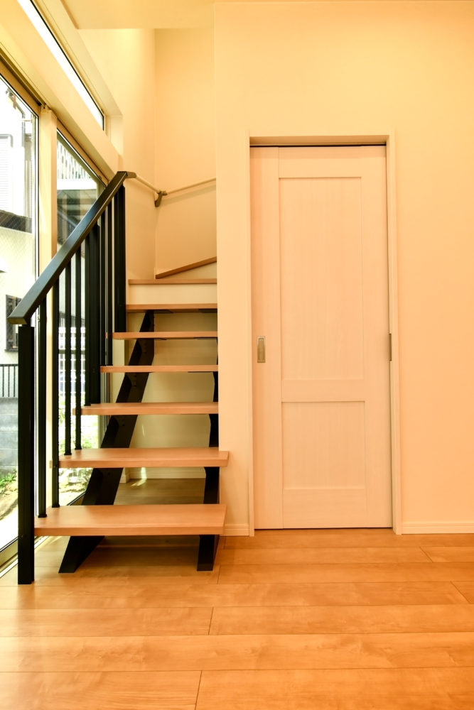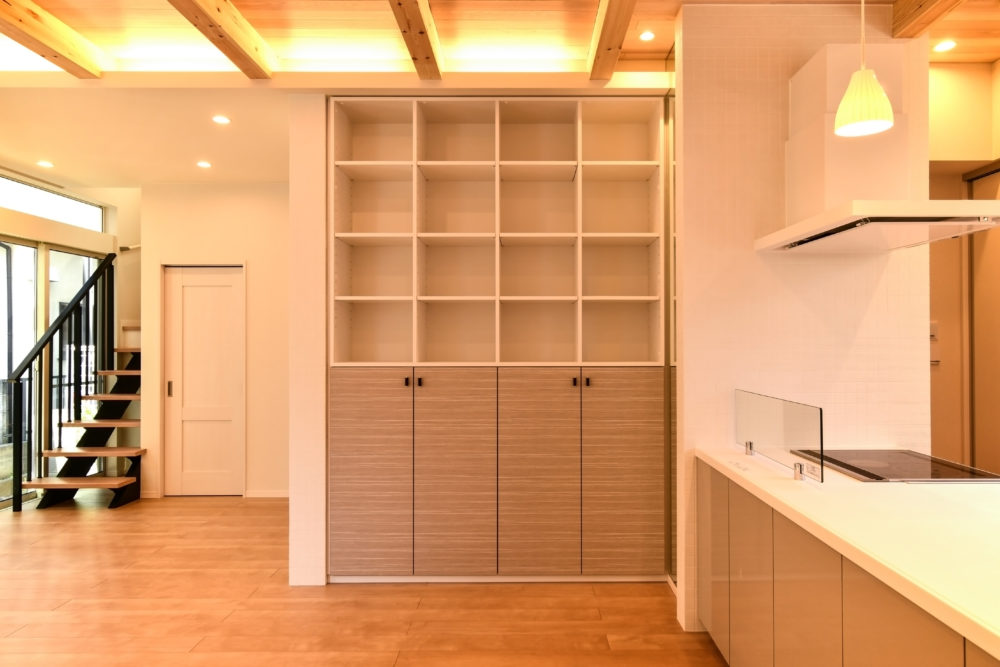 リビングには、先程の玄関を入ってすぐの収納の裏面があり、これまた収納として使用することができます。大工さんが造作で作っている収納なので、家との一体感も抜群です。