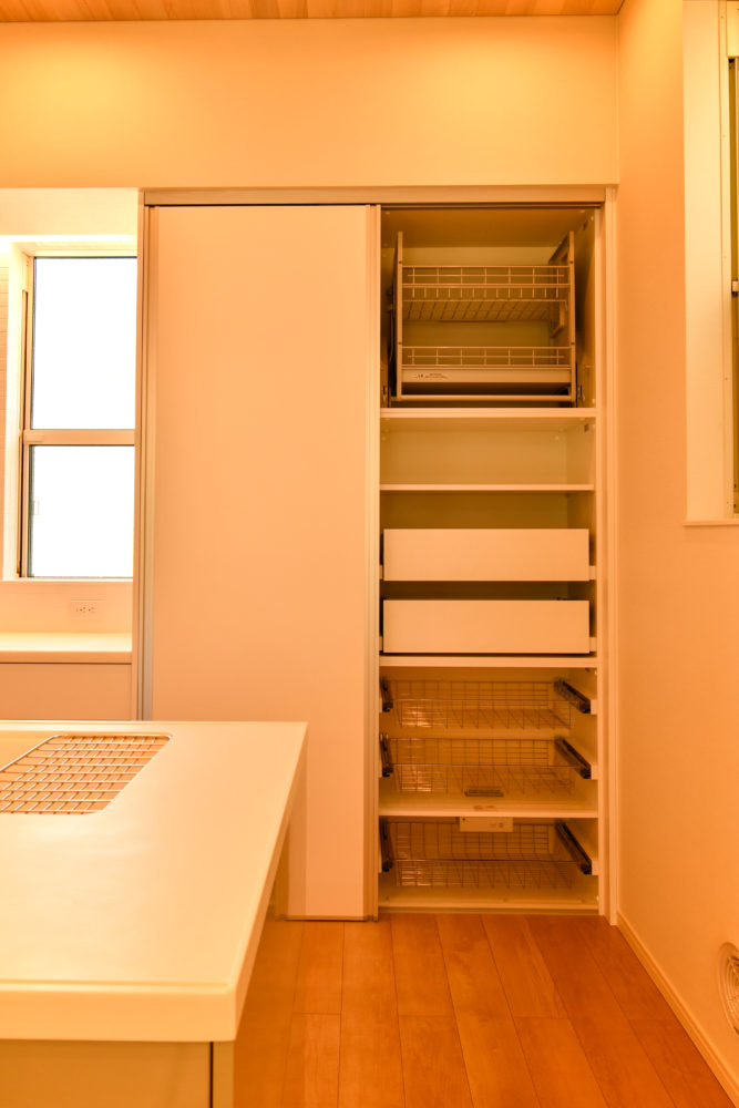 キッチンよこのパントリースペースには、野菜を新鮮に保存することも可能な、大容量のストックスペースを設置しました。食材などを購入した際も、ここに収納することによりお部屋に「生活感」を出さずに、スッキリと生活することができます。