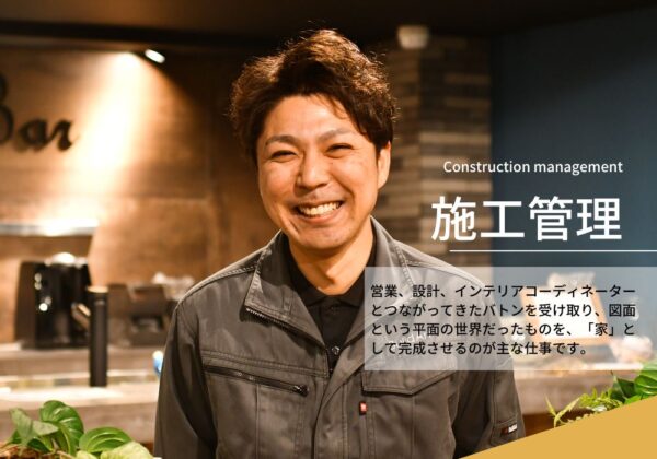 営業、設計、インテリアコーディネーターとつながってきたバトンを受け取り、それまで図面という平面の世界だったものを、実際に立体物としての「家」として完成させるのが主な仕事です。また、現場を運営していくに当たり多岐にわたる業者さんや大工さんと関わり、竣工を目指して行くことになります。そんな中で求められるのは専門知識ももちろんですが、対人能力やリーダーシップが求められる業務なので、非常に学びの多い仕事であると考えております。