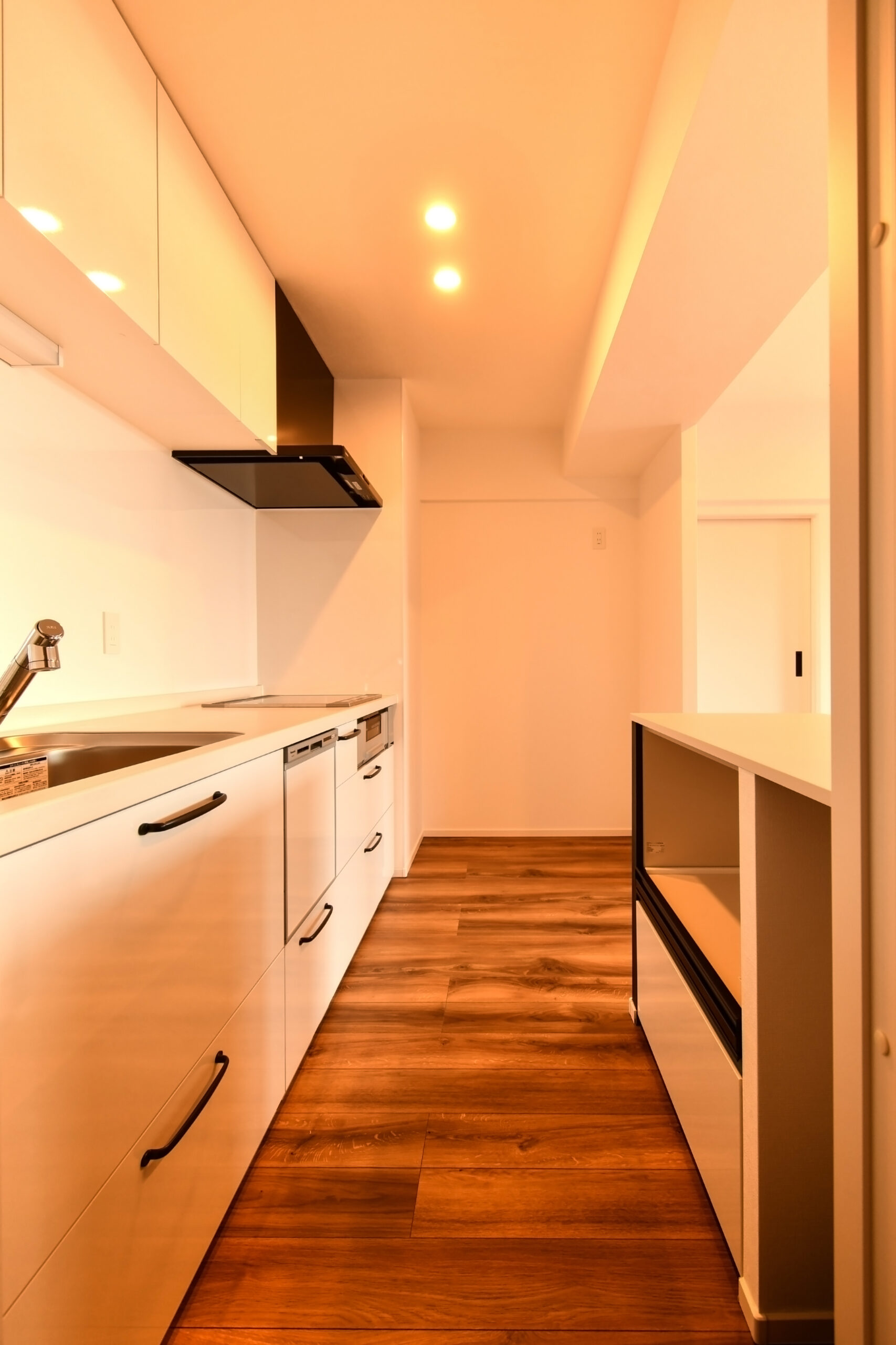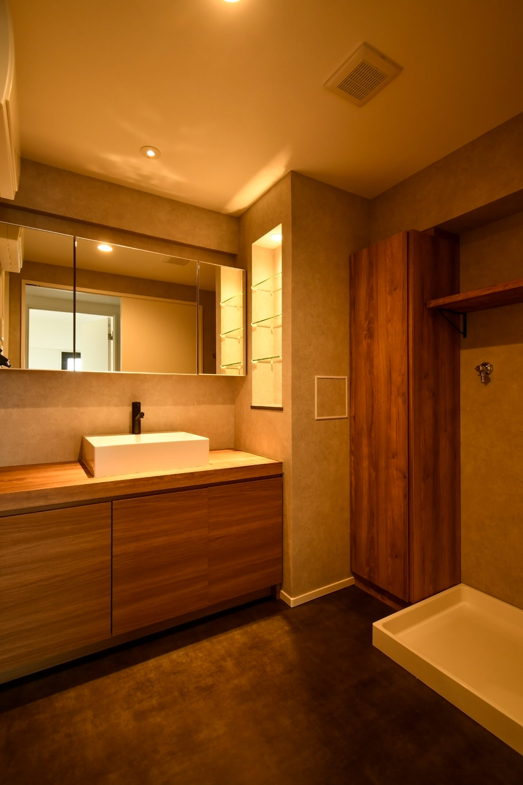 シンプルで甘すぎない空間がお好みのO様。統一した木目にブラックを効かせるのみに抑えたインテリアで間接照明が映える空間とし、さらに洗面室はガラス棚のニッチや集光タイプのダウンライトを採用してホテルライクに仕上げました。プランのこだわりはやはり明るいオープンキッチン。既存壁と背の高いのカップボードを取り払い、既製品をはめ込んだカウンタータイプの家電収納を造作して、キッチンを移動せずコストを抑えたオープンキッチンが完成しました。 他にも、洋服が好きなO様のライフスタイルに合わせたWICや、AV機器を自由に配線できるフロートTVボードなど、大人のライフスタイルを楽しめる工夫を盛り込んでいます。