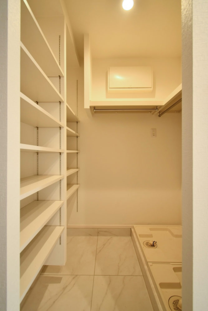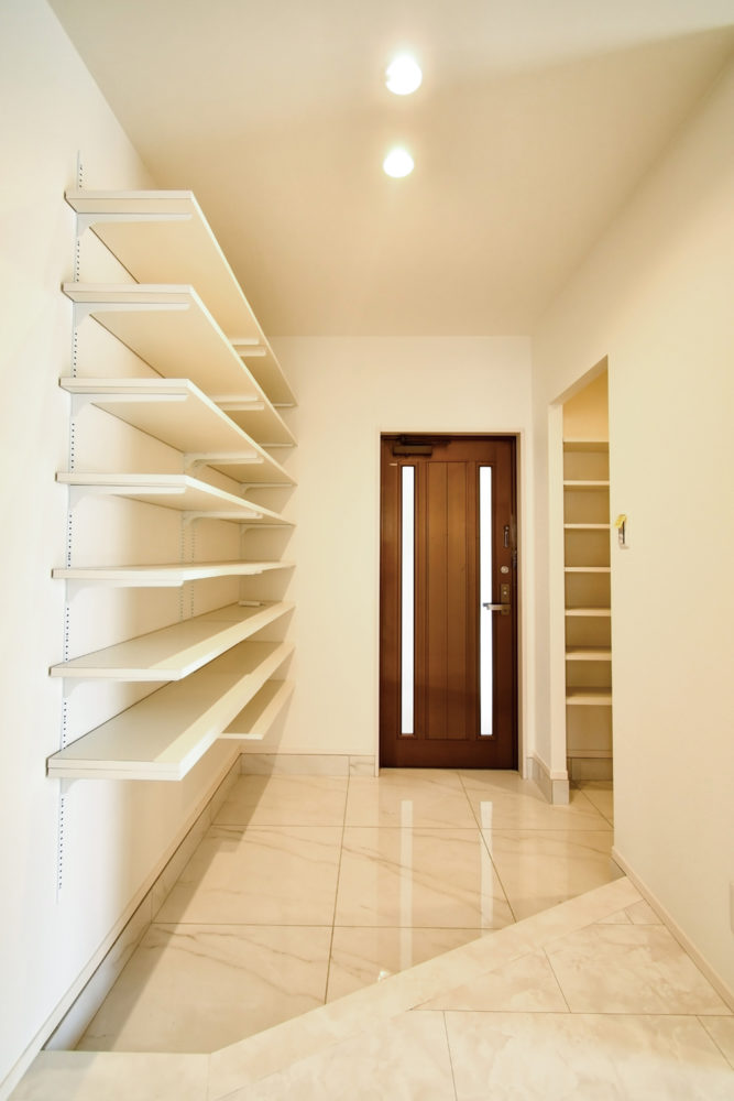土間を埋め尽くしていた大量の靴を収納するため、壁面可動棚とウォークインクロゼットを配置。毎日フル稼働する洗濯機2台も、お子様達が帰って来てすぐに洗濯物を出せるよう玄関先に置きました。