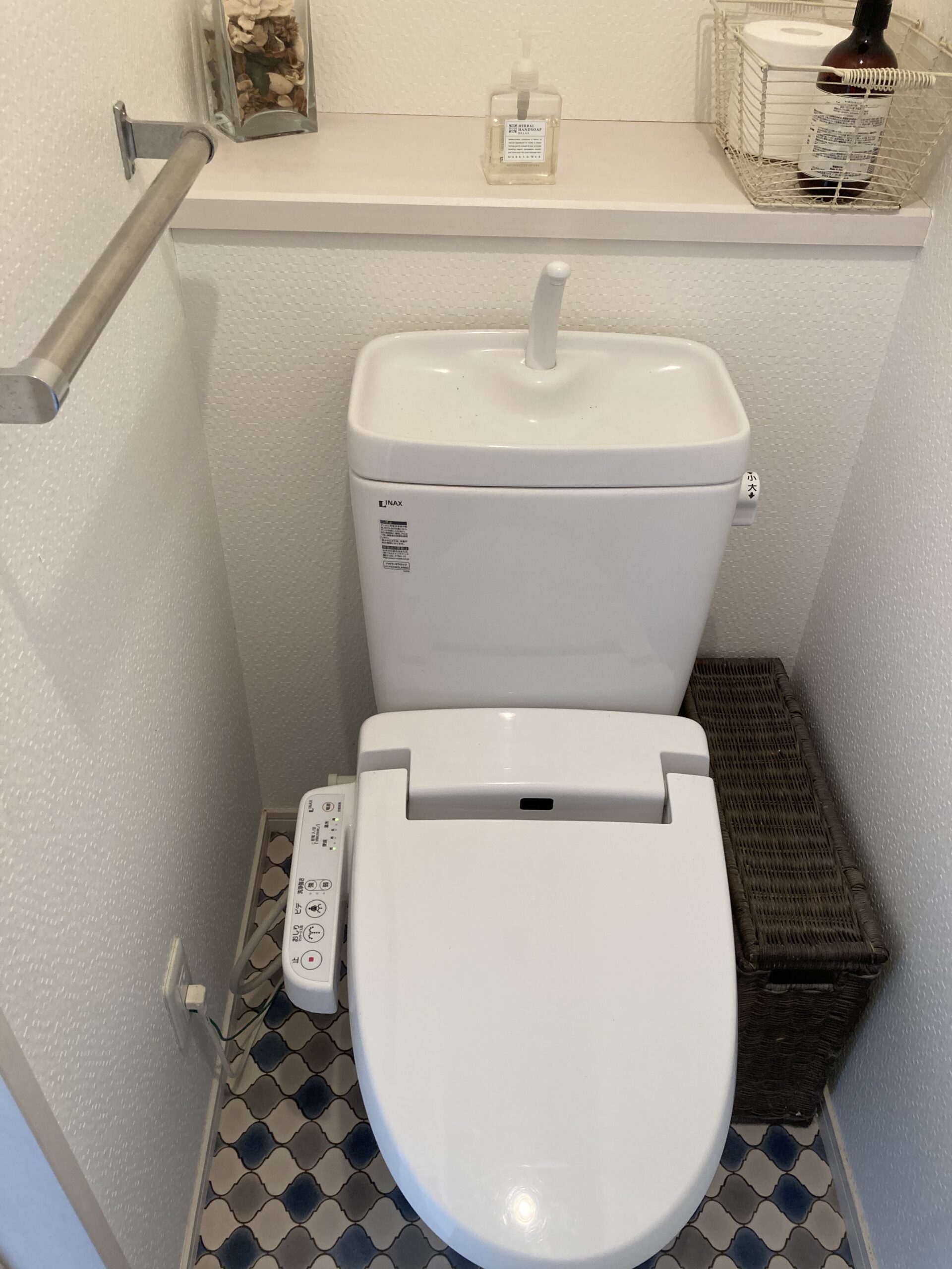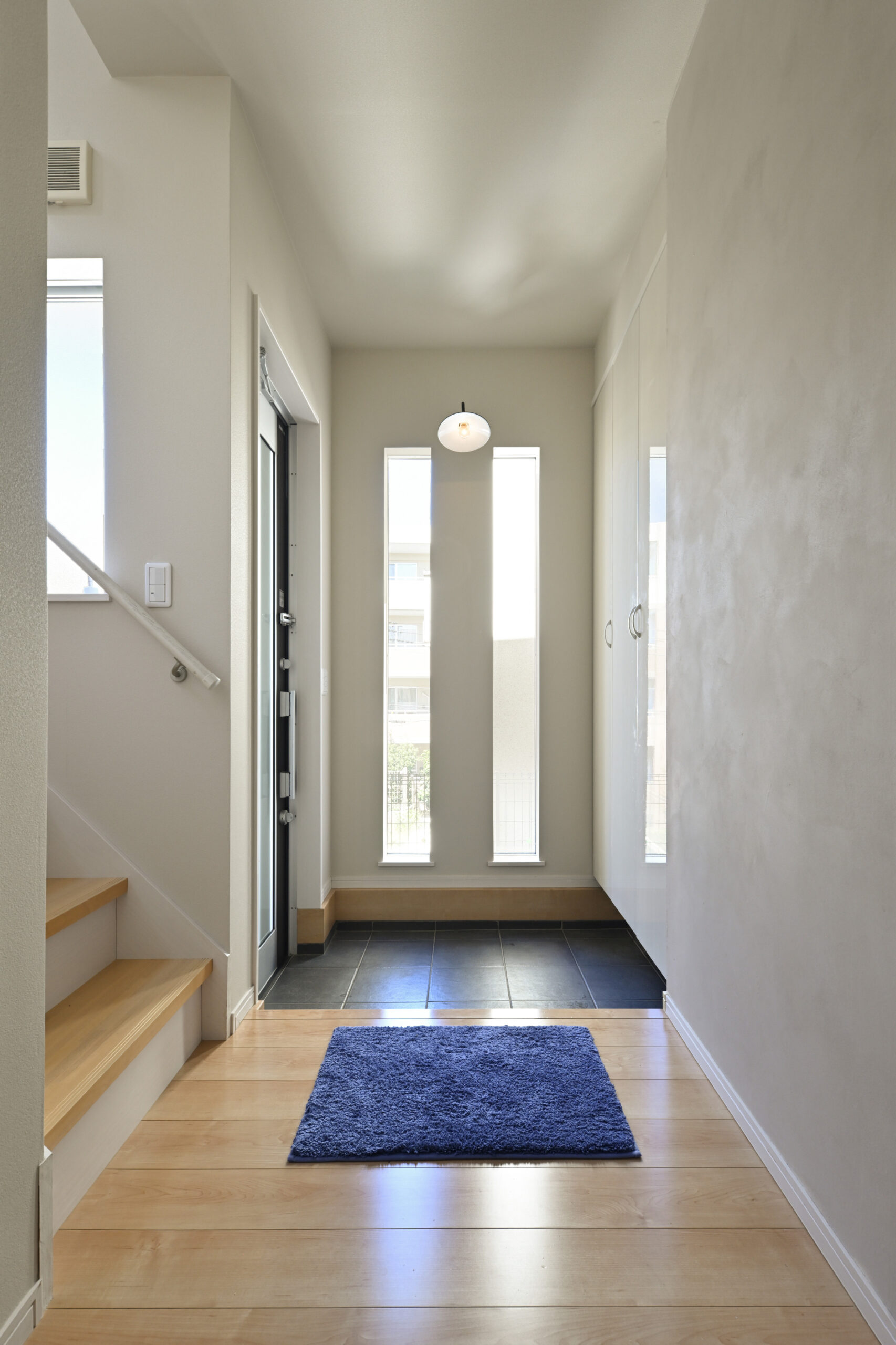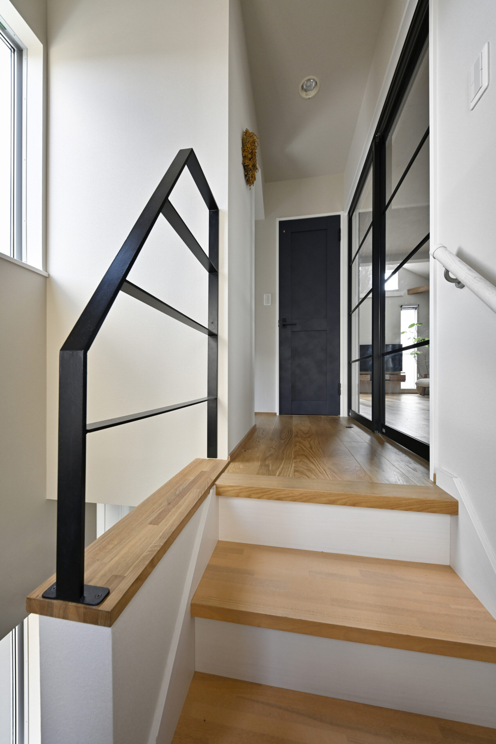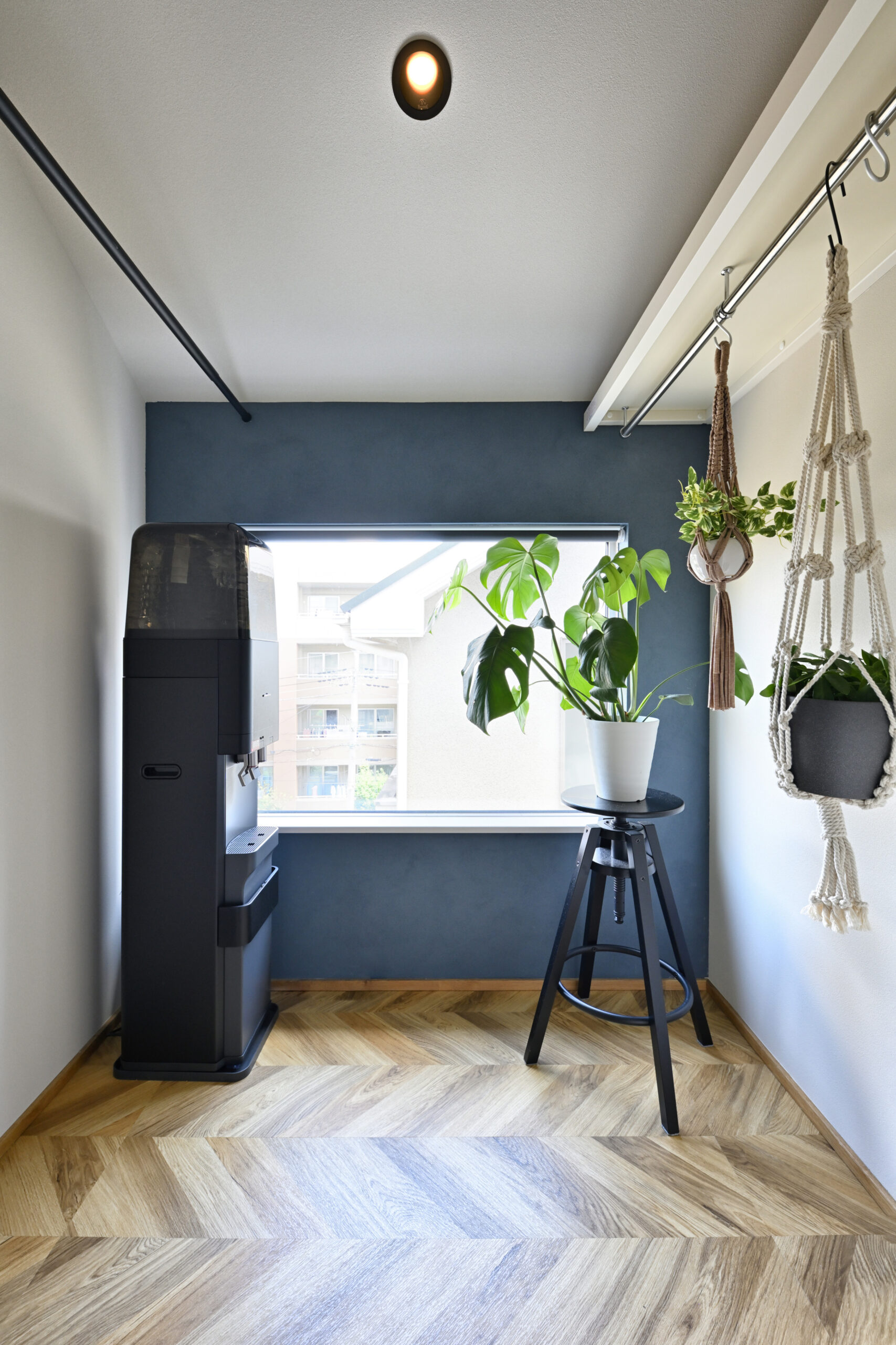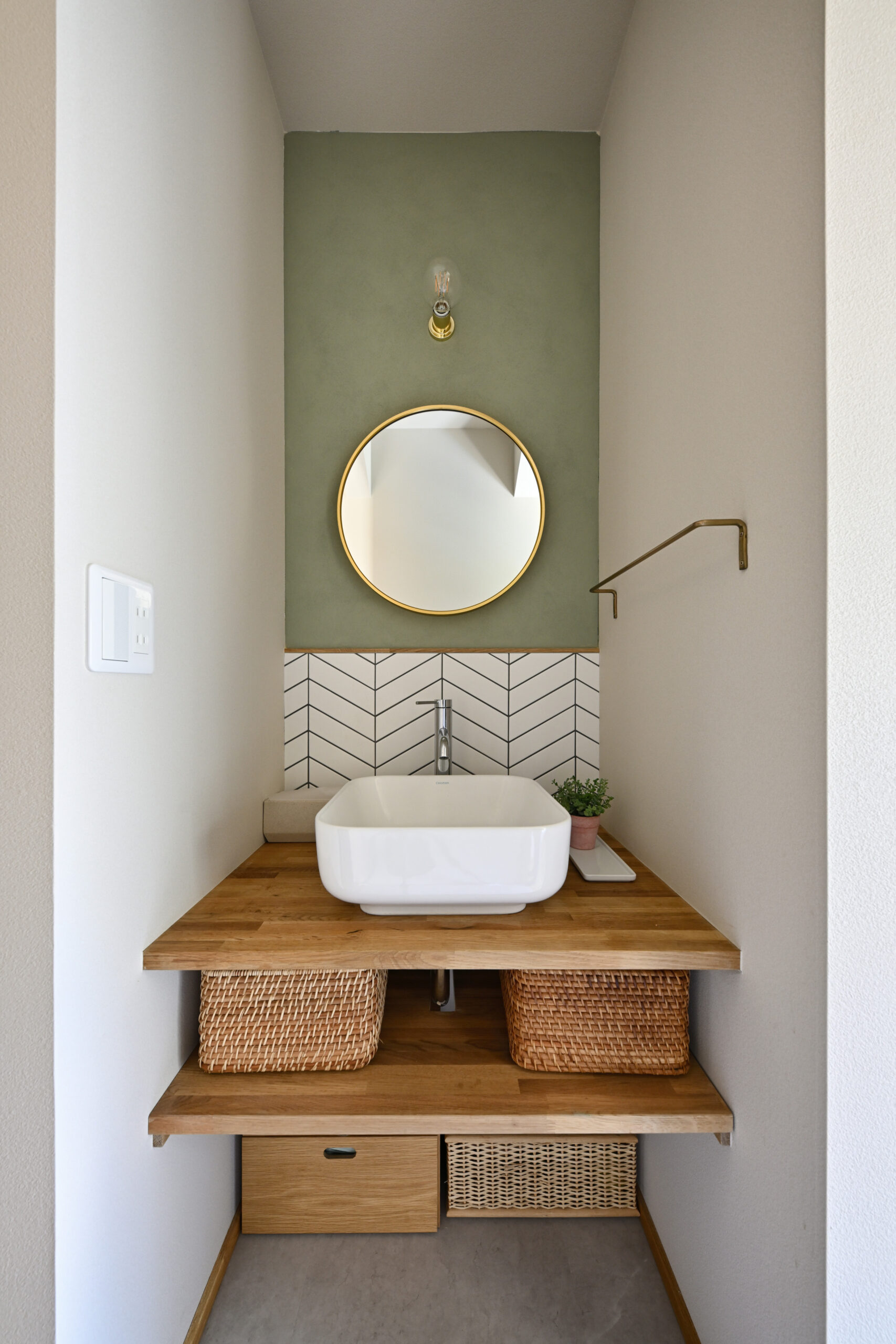 階段上の吹抜部分には新たに床をつくり、WIC(当初予定)と造作手洗器を増設。「WICのつもりが素敵になり過ぎて(笑)、主に生徒さんの着替えスペースとして使っています」とA様。元和室の収納を無くした代わりにつくったWICは、収納機能はほとんど果たしていませんが、不思議と断捨離した状態をキープできていると言います。完成から半年以上経った撮影時もとてもきれいな状態をキープされていてほとんどスタイリングの必要は無し。それでも「リフォームしたらもっと物を減らしたくなりました!」と意気込んでいました。