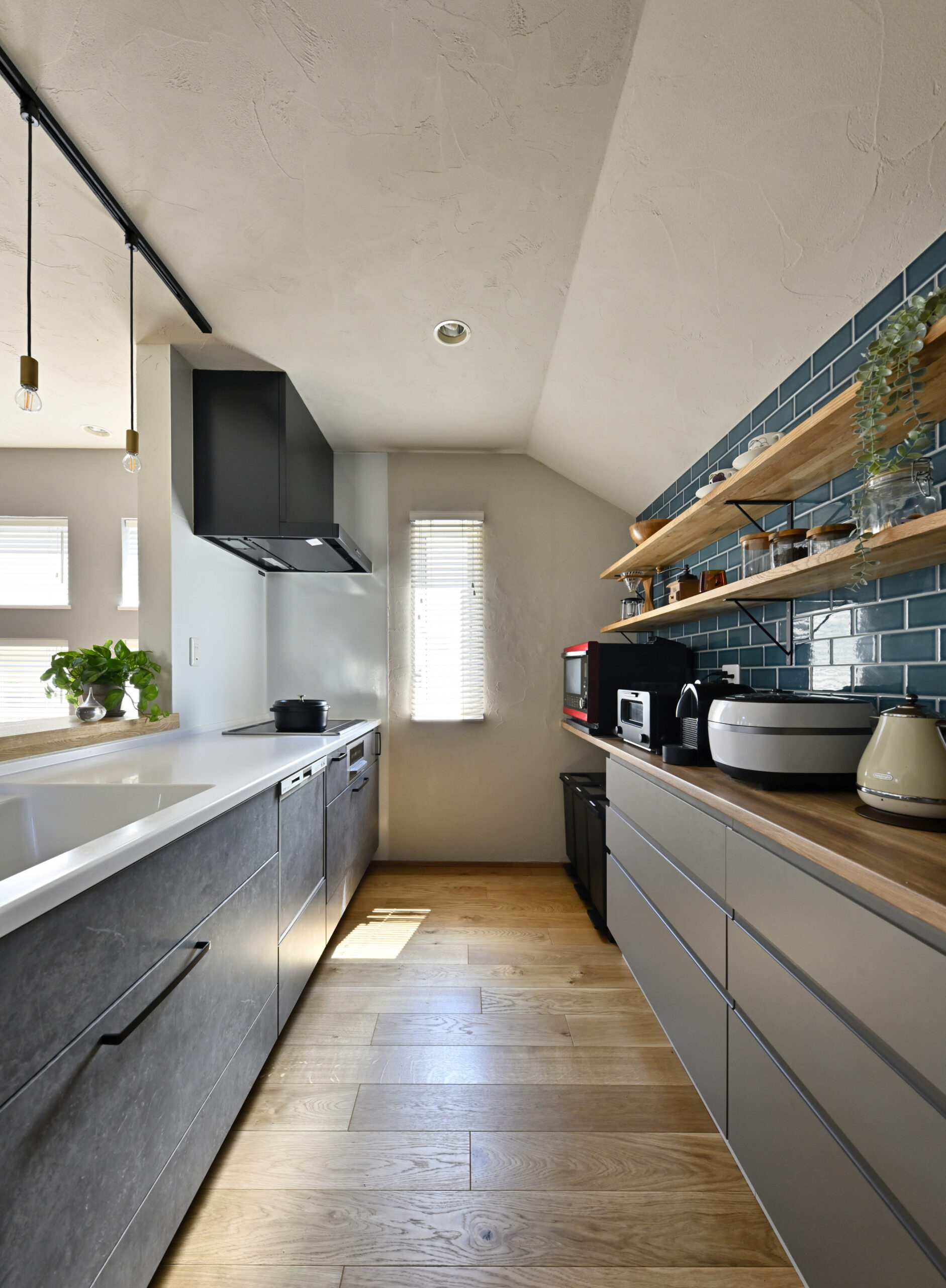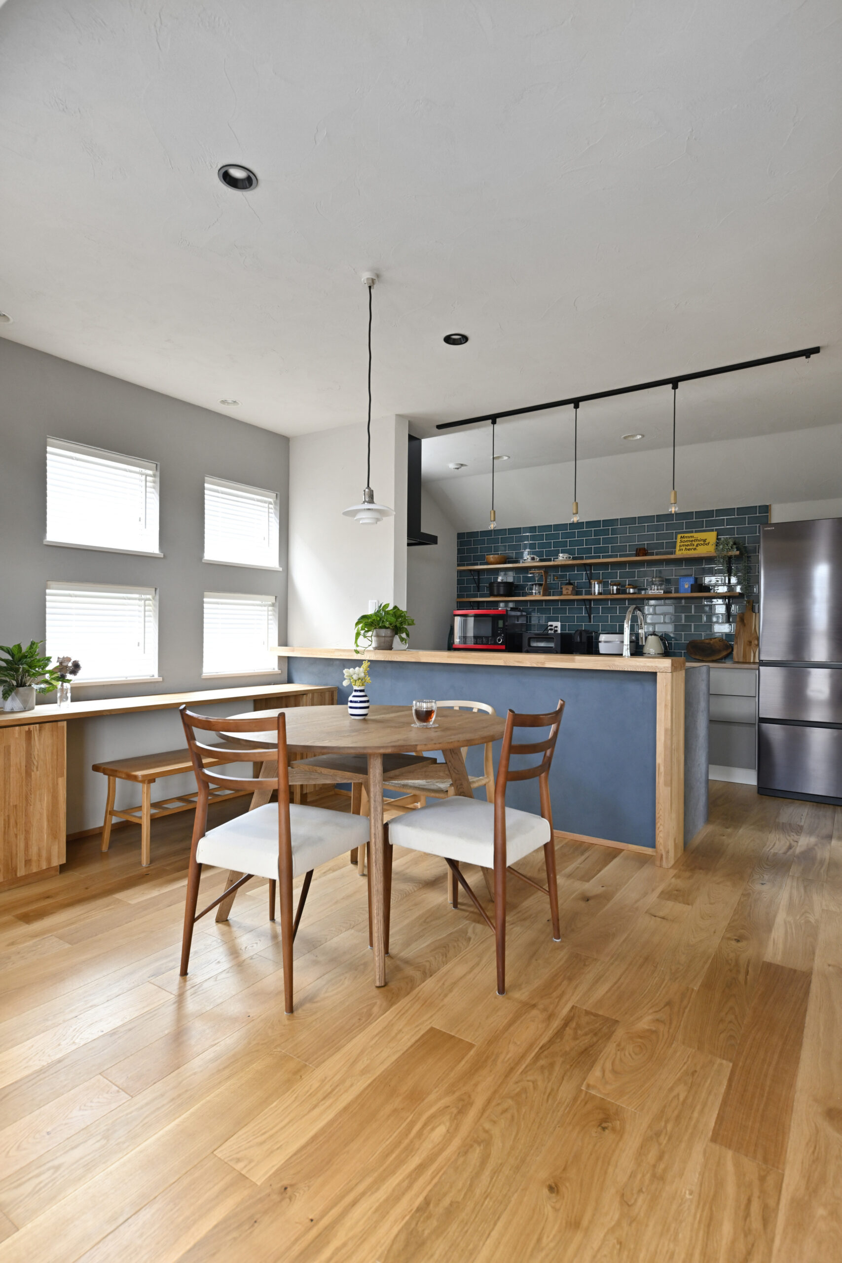 今回できる限り自然素材を使ったのも、生徒さんたちになるべく気持ちよくヨガ時間を過ごしてもらいたいというA様のこだわり。床材には、表面がさらっとして素足に気持ちいいオイル塗装の無垢オークを選び、壁と天井には調湿性能に優れた珪藻土を全面に塗りました。生徒さんたちには「部屋に入ってくると空気が違う!」ととても好評だそう。他にも、アクアブルーやヘリンボーンのクラフトタイル、塗装体験に通って選んだグレーブルーやセージグリーンの塗料、オーク集成材のカウンターや造作収納、真鍮の照明器具や金物など、A様のこだわりが随所に詰まっています。