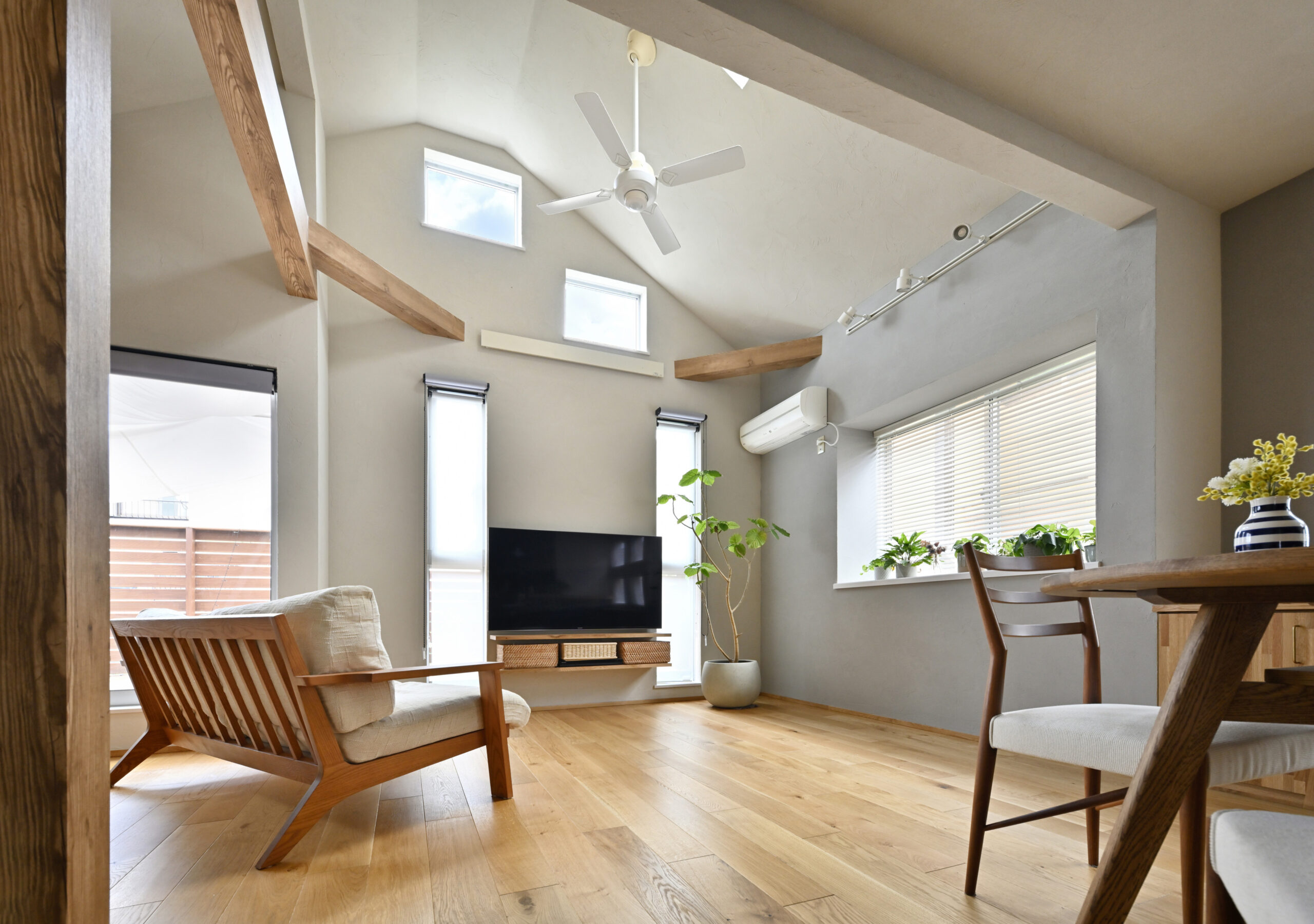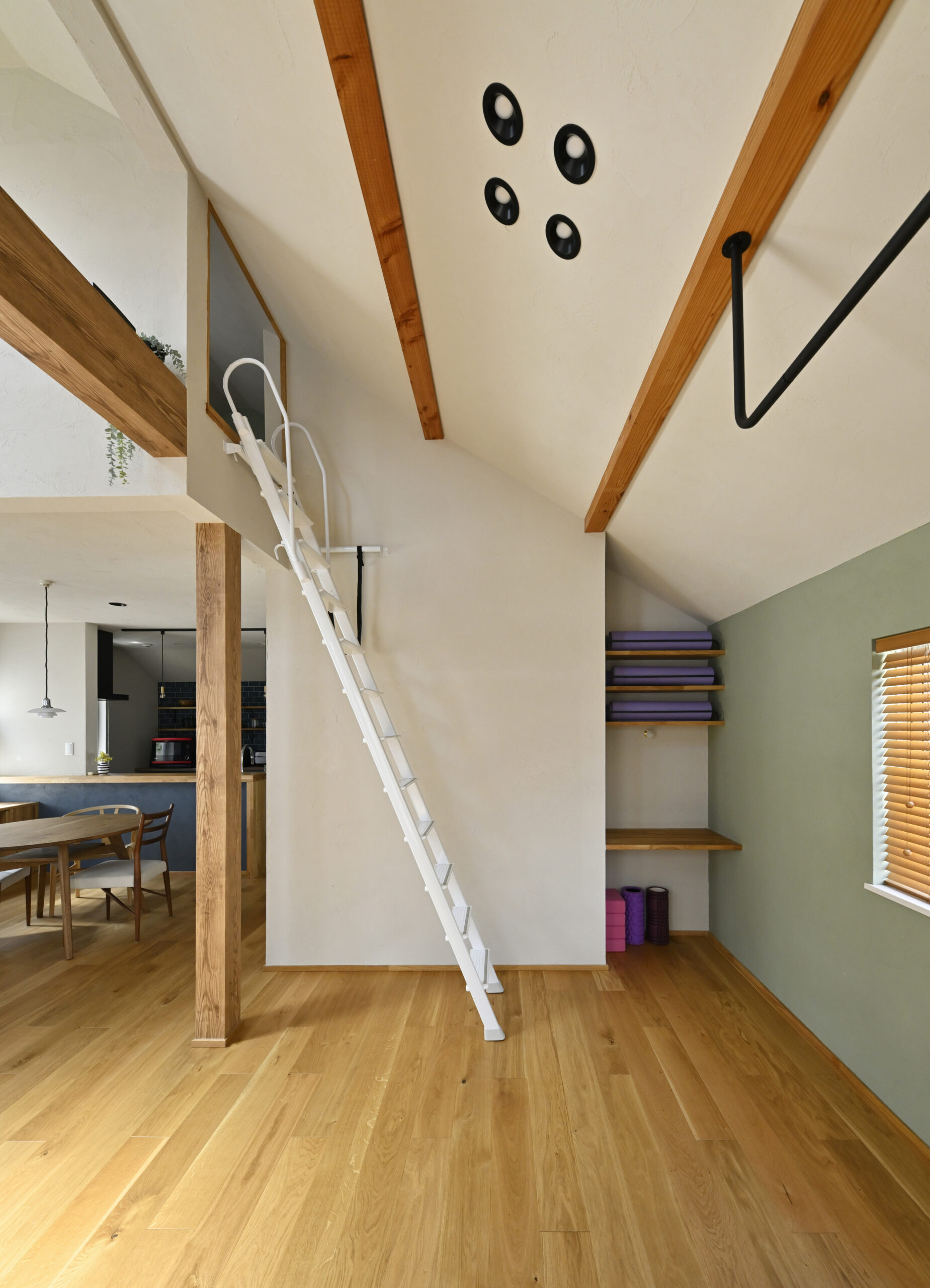 今回一番のこだわりは、リビング隣の和室天井を解体し、元々吹抜けだったリビングの勾配天井と繋げて開放的なLDK兼ヨガサロンに生まれ変わらせること。リビングと和室の間の構造上大切な大梁は残りましたが、梁補強や火打ちと共に木部が強調され、自然の中でヨガを体験しているような気持ちのいい空間になりました。飼っているインコのマリンちゃんも気持ちよさそうに飛び回り、よく梁にとまって休憩しているそうです。