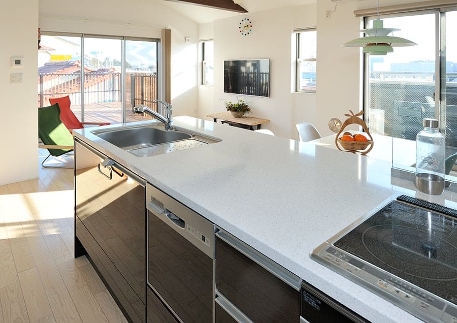 ご主人にはご要望通り愛車3台を思う存分いじれる男の空間を。家の中はあえて白壁に白木を使い、ガレージとは区別してファミリーを意識できる雰囲気を作りました。バルコニーで遊ぶ子どもたちも見渡せるオープンキッチンは奥様のお気に入りだそうで、みんなに喜んでもらえる家が完成して良かったです。