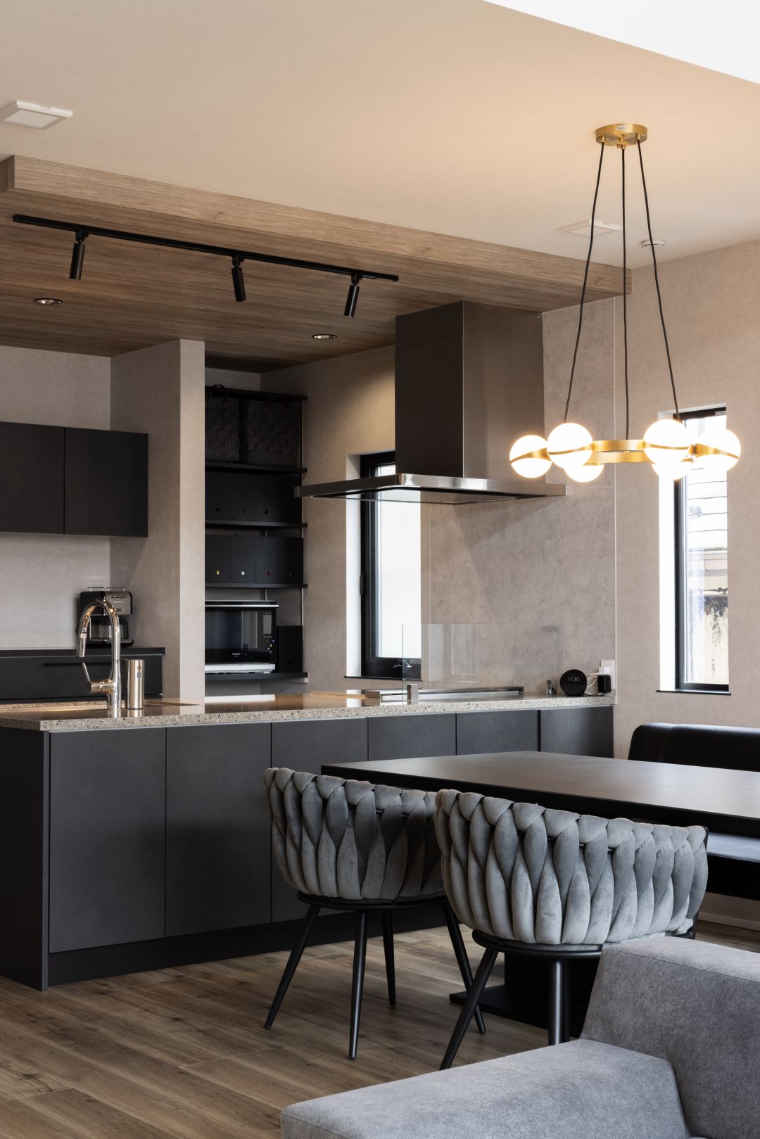 黒とダークブラウンを基調としたシックなインテリア。木目の下り天井がアクセントになっています