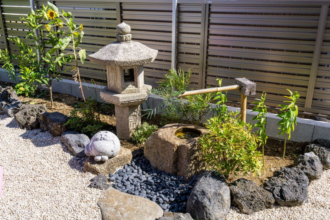 家の正面には灯篭とつくばいとかけひ。和の要素を取り入れています