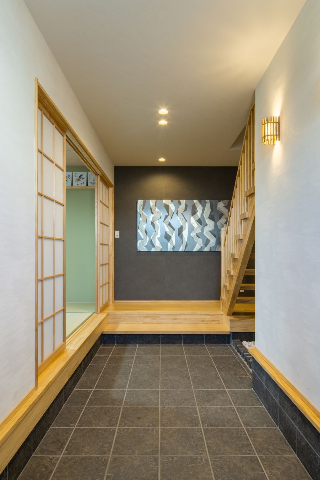 大きな土間を備えた玄関。和の意匠と現代的な素材感が調和した上品な仕上がりになっています