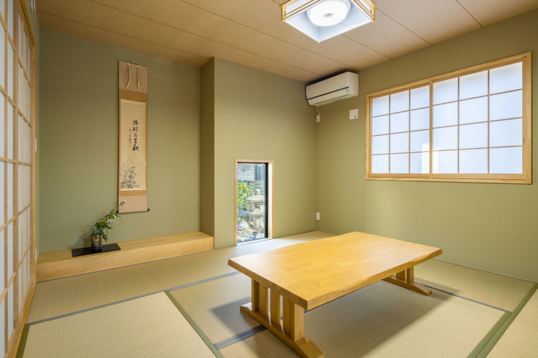 床の間のある伝統的な和室を意識した空間。FIX窓から、灯篭やつくばいが見えるようにプランニングしています