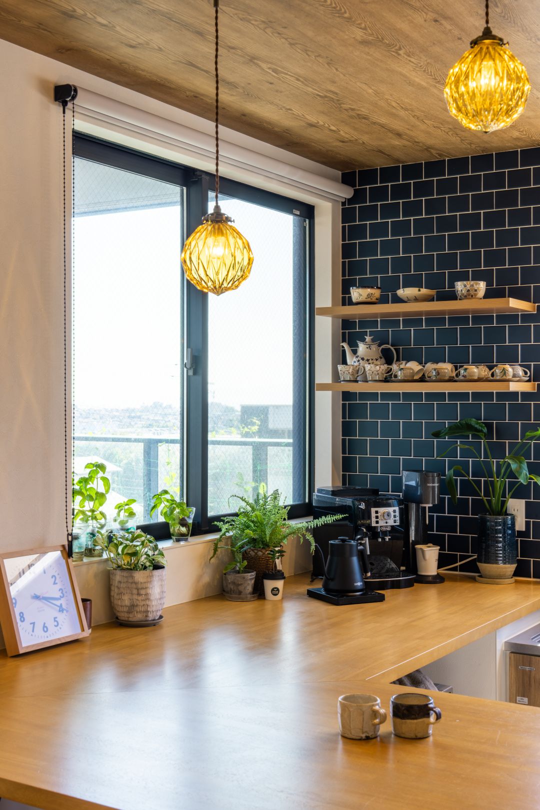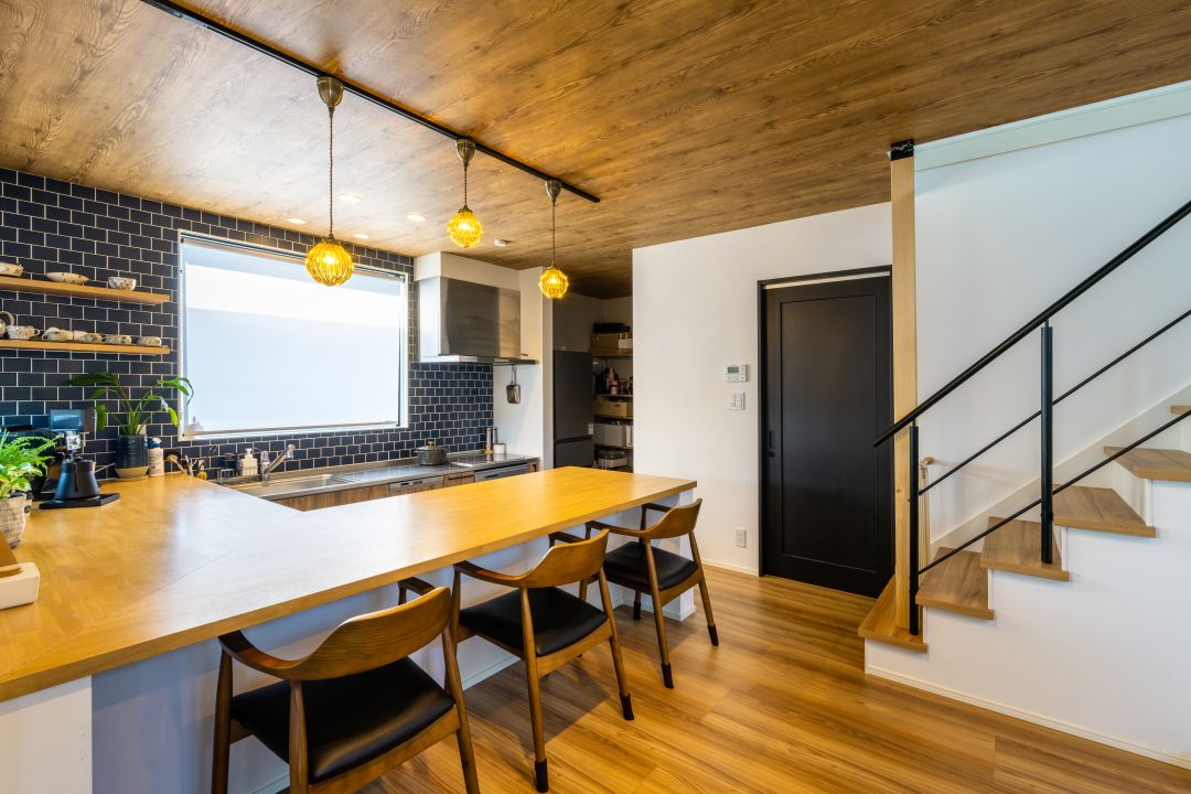 ダイニングの床面からキッチンだけ一段下げたダウンフロアキッチンを採用。手前は造作のL字型カウンターテーブル、壁には紺色のサブウェイタイル。冷蔵庫の入る大きなパントリー、大きな窓のある明るい空間など、奥さまの希望を詰め込んだステキなキッチンです