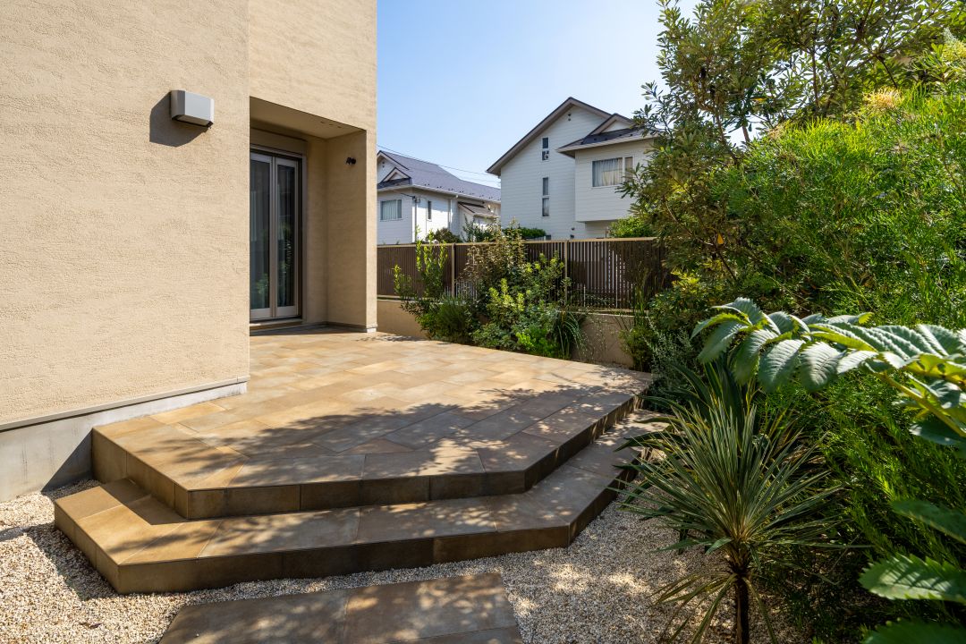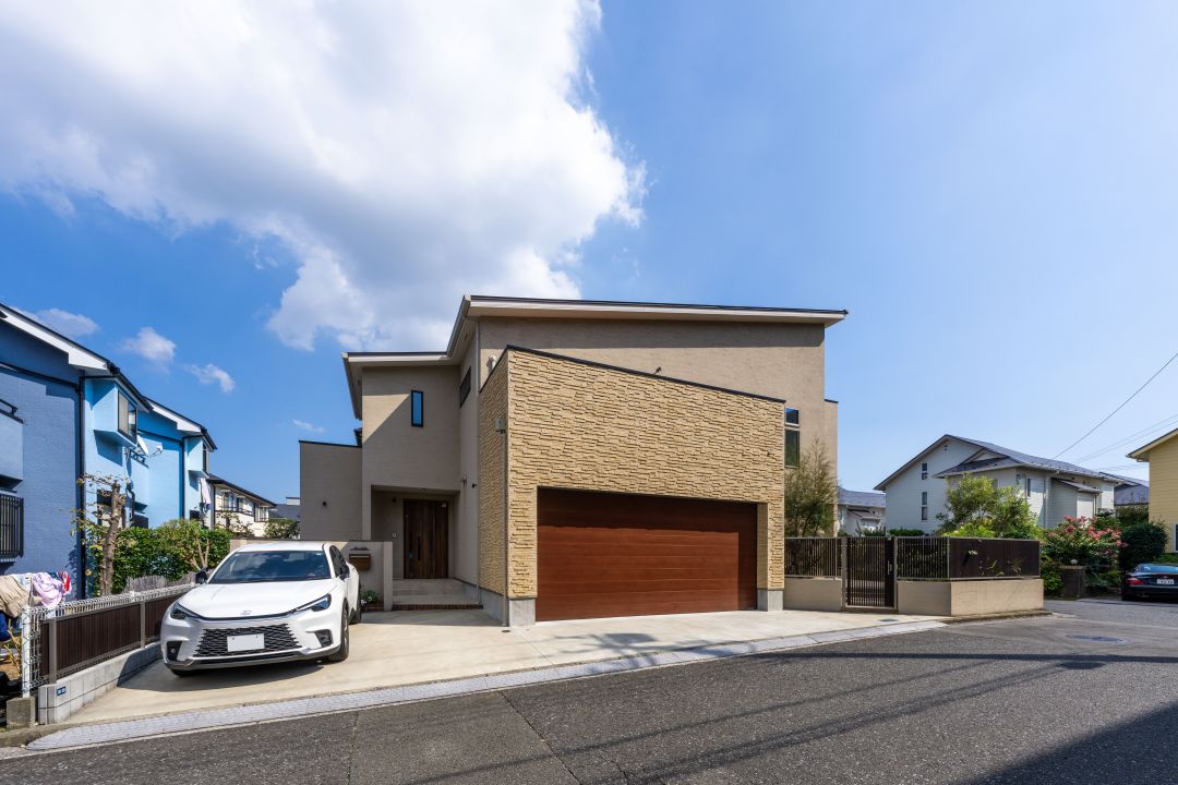 木目のガレージシャッターと石調タイルの外壁が、温もりと重厚感のある印象を与えています