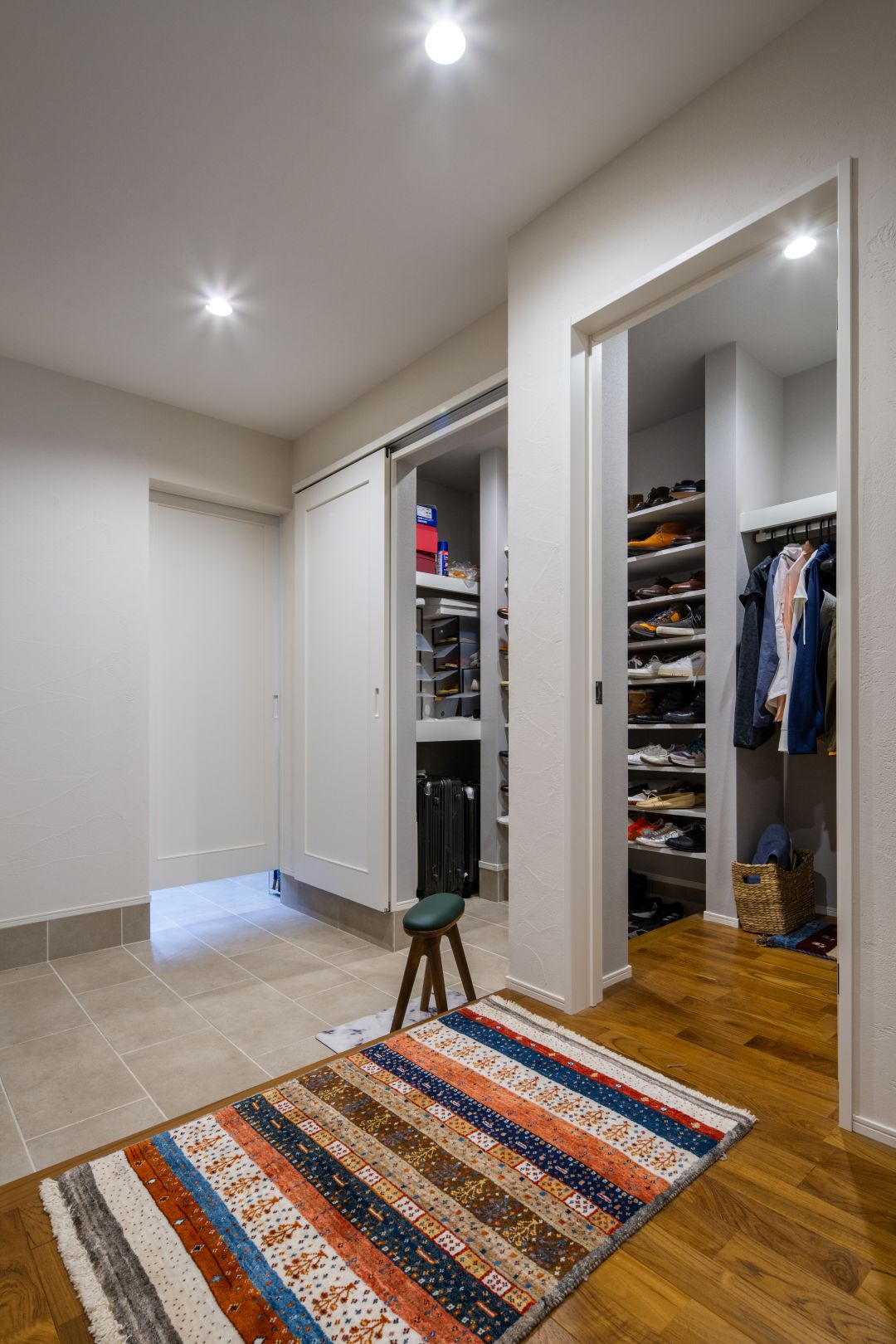 写真右側のシューズクロークと洋服掛けのほか、奥の扉の先も土間収納。たっぷりの玄関収納がA様のご要望でした