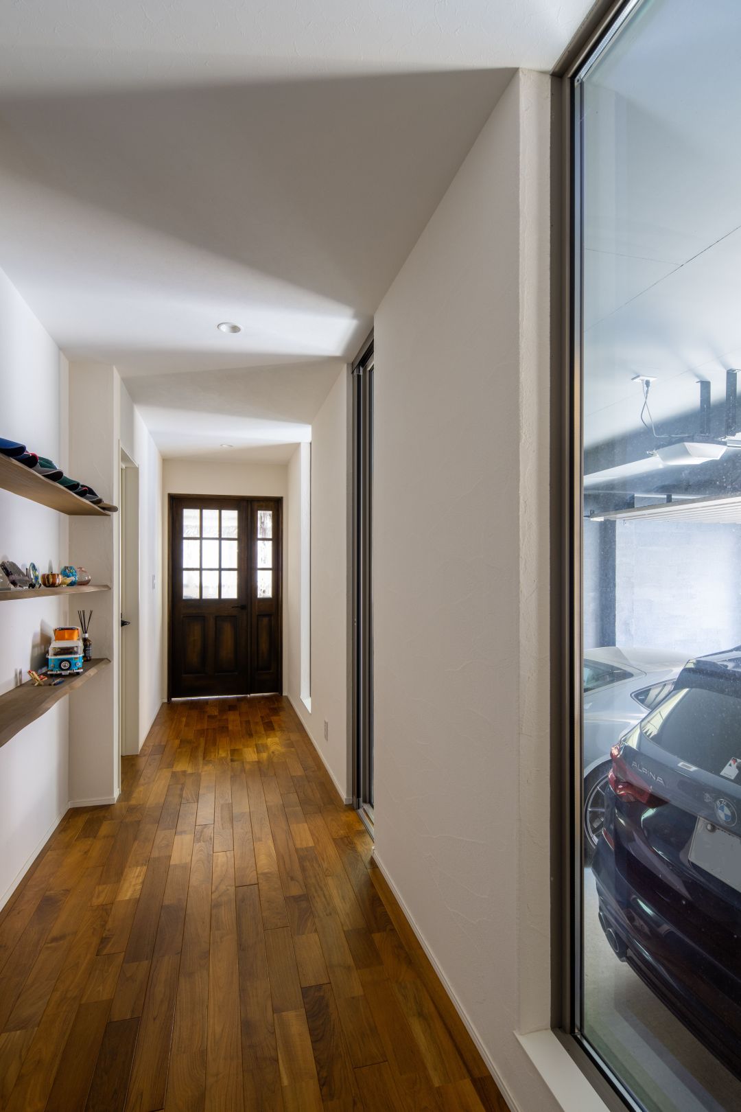 愛車を眺められるように、ガラス窓を採用した廊下。左側の棚にはご主人の趣味のベースボールキャップと、LEGOで作ったバスをディスプレイしています