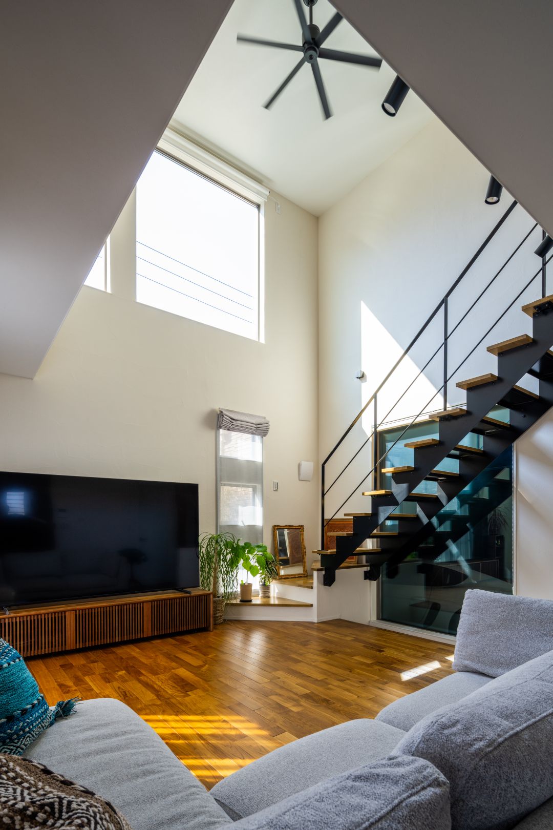 A様のご要望は、大好きな車をリビングから眺められる家。大手ハウスメーカーの提案ではなかなか満足できず、ビルドアートのプランに魅力を感じていただき、今回の家づくりがスタートしました。住まいの中心となるのは、2台分のビルトインガレージと、宙に浮いたようなアイアンのスケルトン階段が特徴の吹き抜けリビング。大きな窓越しに、ソファーでくつろぎながら愛車を眺めることができる贅沢な空間です。さらに、窓際の床を一段下げてベンチ風に仕上げ、間近で愛車を楽しむこともでき、クルマ好きのための理想的なプランとなりました。また、ガーデニングや観葉植物が好きな奥さまのご要望で、室内にはグリーンのコーナーや、お庭はロックガーデン風に。ご夫婦ともに暮らしを楽しめる住まいとなっています。