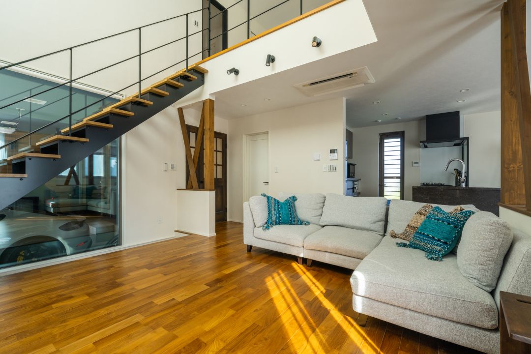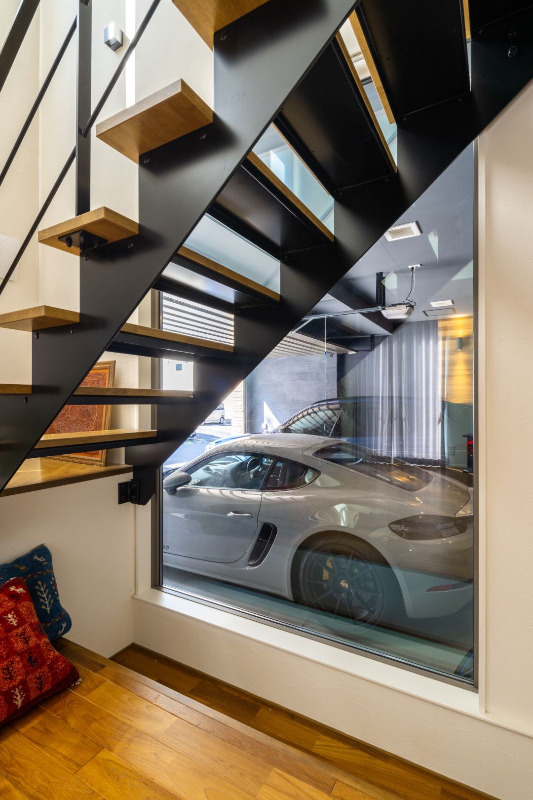 ポイントは宙に浮いたようなデザインのアイアンのスケルトン階段と、車が眺められる大きな窓