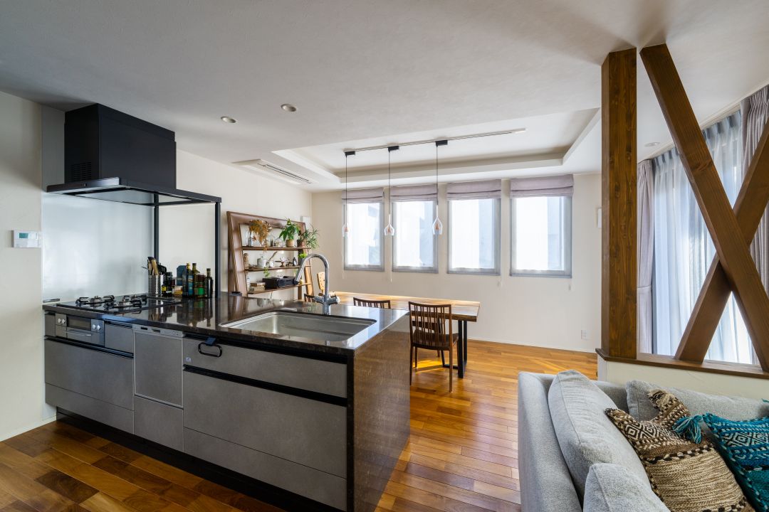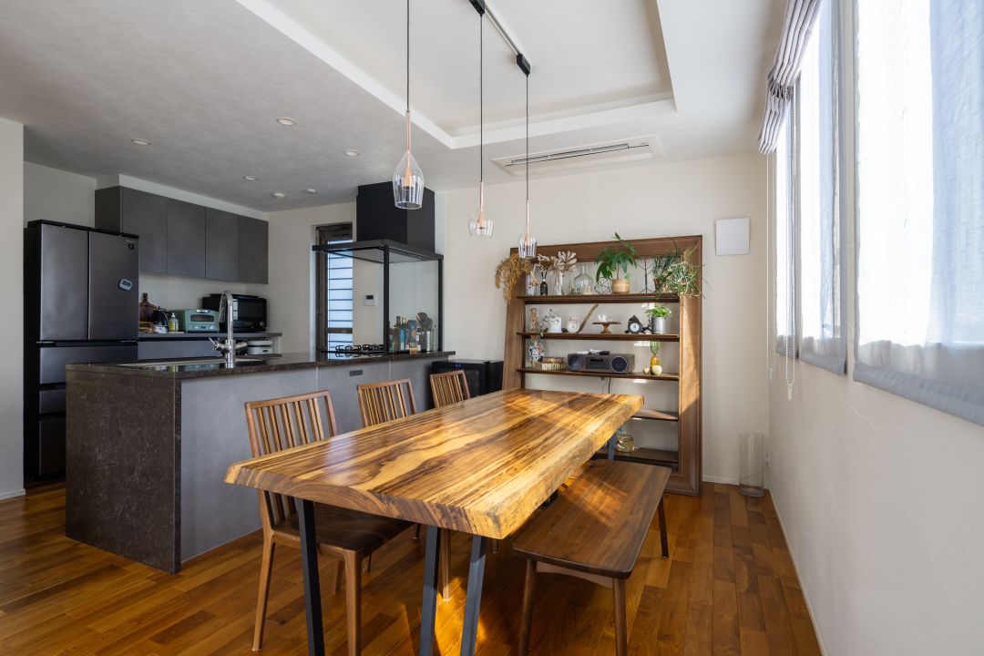 4連窓から日差しの入る明るいダイニングキッチン。テーブル奥のオープンシェルフに並ぶ奥さまお気に入りの観葉植物が、空間に彩りを与えています