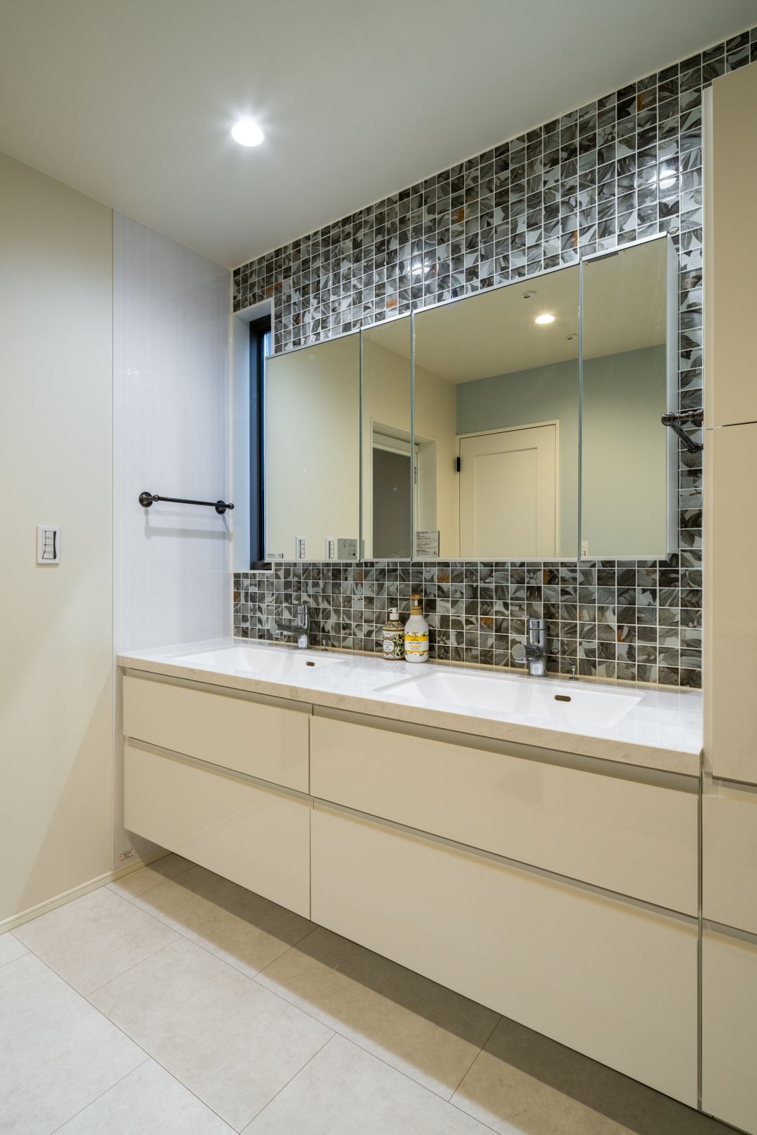 ダブルボウルのワイドな洗面台。壁面に貼ったモザイクタイルが空間のアクセントになっています