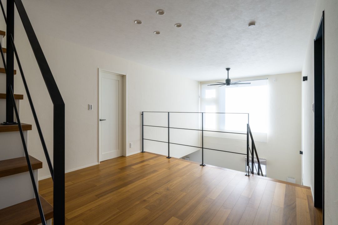 家族のプレイスペースとして活用できる、広い階段ホール。手前のアイアンの手すりは、ロフトへ上がる階段です