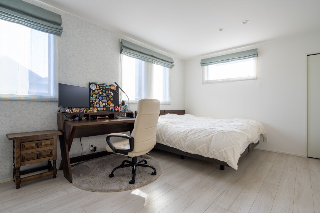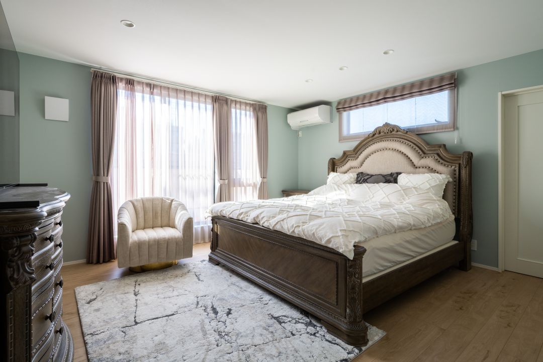 モダンクラシックテイストの、上品で落ち着いた雰囲気の寝室。写真にはありませんが、このお部屋には2つのウォークインクローゼットを配置しています