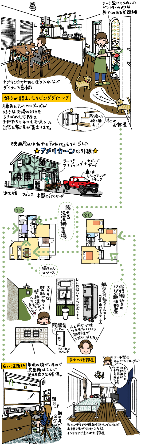 若いころに「バック・トゥ・ザ・フューチャー」の映画を観てから、そこに出てくるような家に住みたかったという奥様と、米軍ハウスが憧れだったというご主人。おふたりのご要望にお応えして、まずは外観、思いっきりアーリーアメリカンにいたしました!緑色が好きだということで、外壁や建具、壁紙など随所にグリーンを使っています。お家の中はアメリカングッズを中心に、照明やスイッチ、壁紙、トイレのタンクなど細部に渡って「好き」をとことんカタチにしました。自営業でお忙しいおふたりなので、家事が負担にならないように、家事動線や収納計画もきっちり考えています。デザインだけでなく、ご夫婦+お子様2人とお母様+猫ちゃんのライフスタイルを軸にした、家族全員が暮らしやすい家、完成しました!