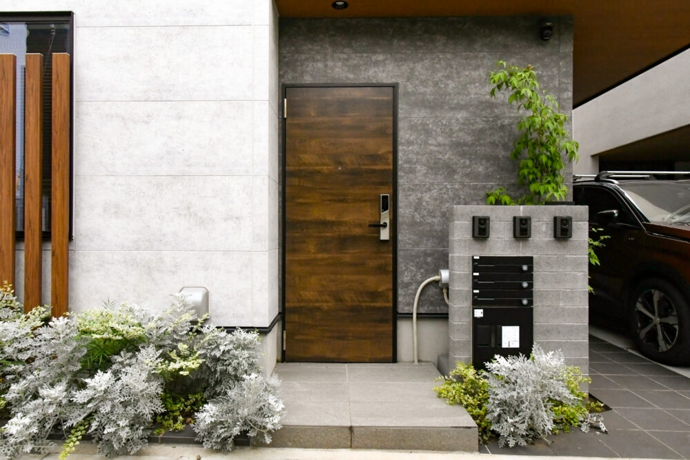 グレーの外壁に木目の玄関ドア、ルーバーが洗練されたおしゃれな雰囲気を醸し出します