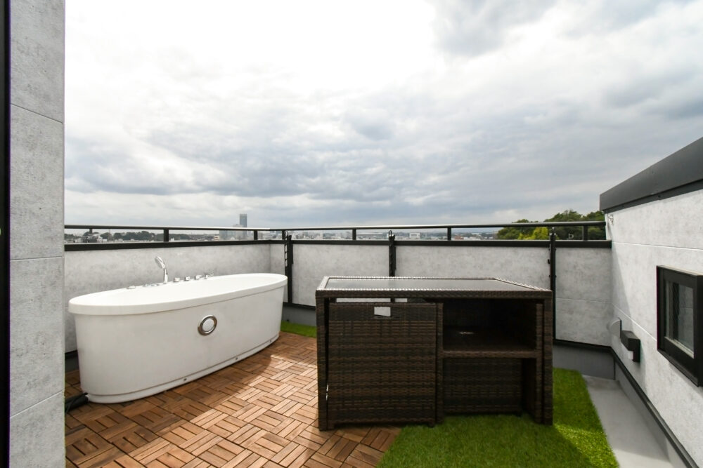 屋上スペースにはバスタブを設置し、晴れた日には富士山も見渡せる、見晴らしのよい絶好のロケーションで露天風呂が楽しめます