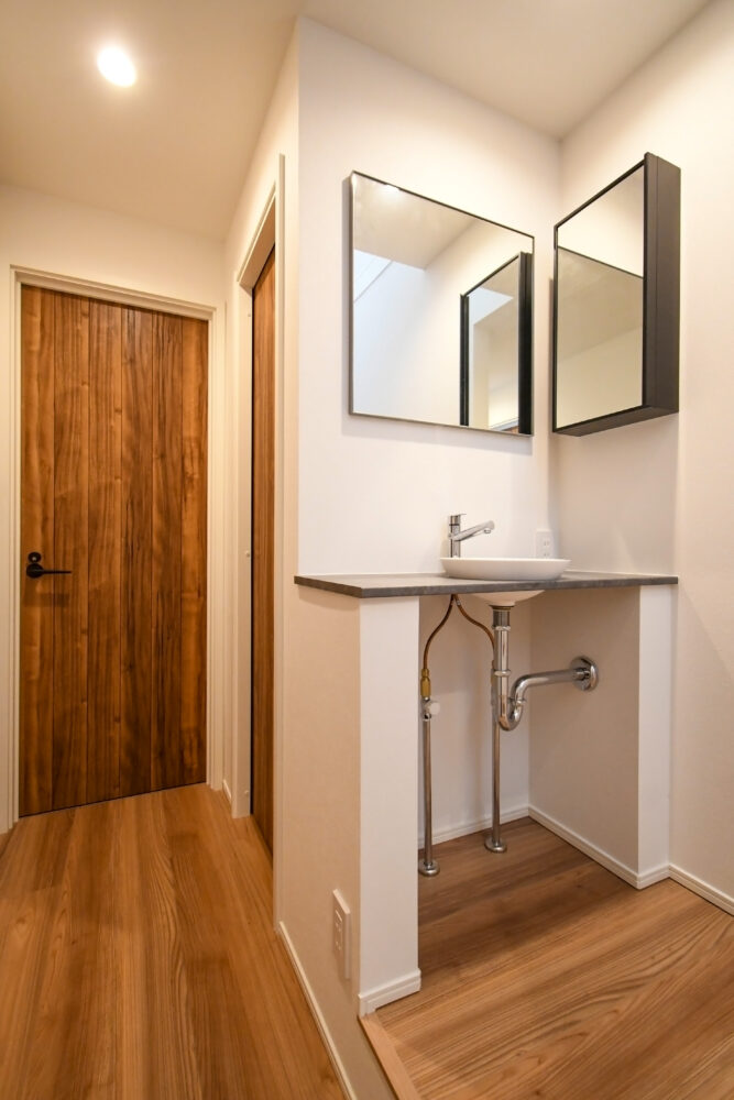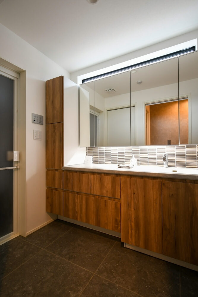 広々とした洗面台は収納も大容量!暖かい木目デザインでおしゃれな空間に