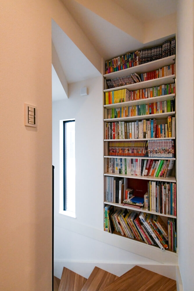 階段のスペースには上までたくさんの本が収納できる本棚をつくりました。可動式レールで一段の高さが変えられるので、ぴったり収納できます