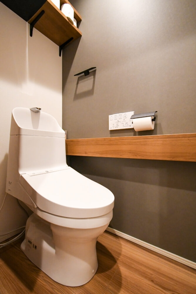 スタイリッシュなトイレと洗面台。空間を最大限利用するために、洗面台の配管がトイレの壁にある木の棚の中を通っています
