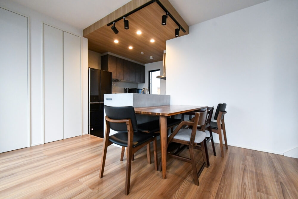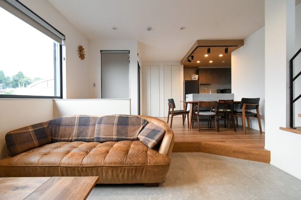 リビングとダイニングそれぞれの床色を変えて境界に段差を設ける事で、メリハリのあるスタイリッシュな空間になっています
