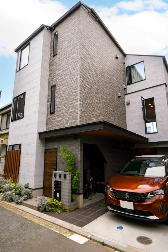 高級感のあるグレー系の外壁でまとめたシックでモダンなデザインです。賃貸部分と住居部分の間に自転車等を収納できるスペースをつくりました