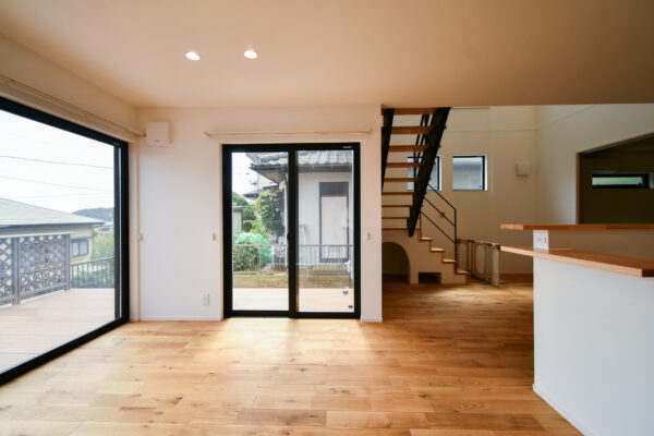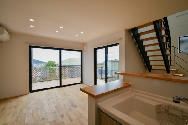 キッチンからは、リビング全体、小上がり和室、階段、加えて外の景色までぜんぶ見える設計。