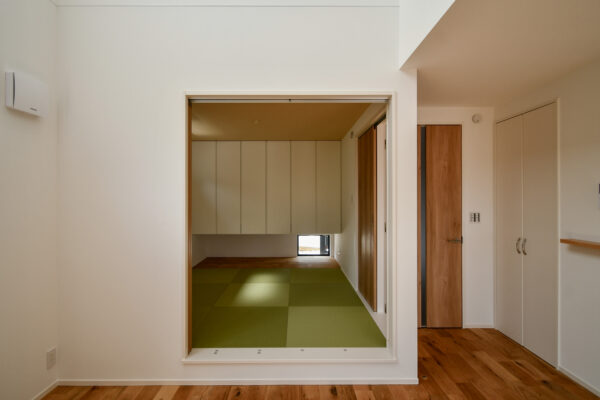 絶えず人気の高い小上がりの和室スペース。緑色が鮮やかな畳ですが、奥を一部リビングの床材にすることで統一感を出しています。