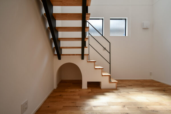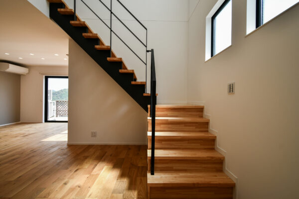 窓のサッシや階段の手すり部分などは黒色で統一。空間にメリハリが出てぐっと洗練された印象に。