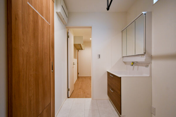 お風呂、洗面脱衣室、ランドリールームが一直線。キッチンへと続く家事ラク動線、[回遊動線]です。