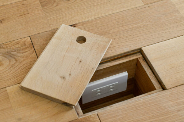床材の一部をくり抜いて、電源タップを埋め込みました。