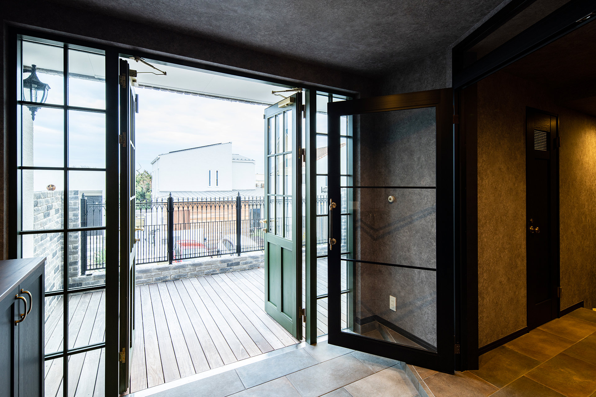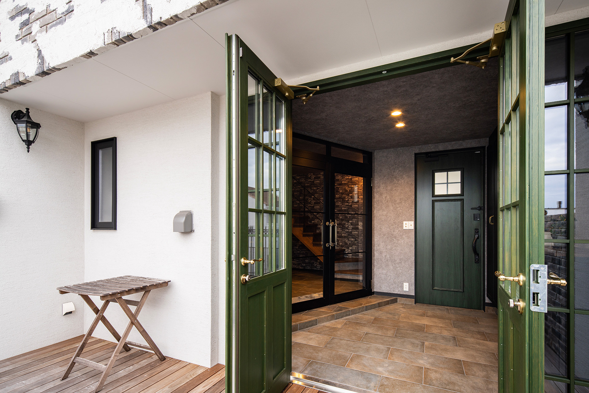 外壁はあえてダメージ加工。ヴィンテージな雰囲気が緑色の両開きドア、れんが調のテラスや黒のアイアンの手摺りがベストマッチです。