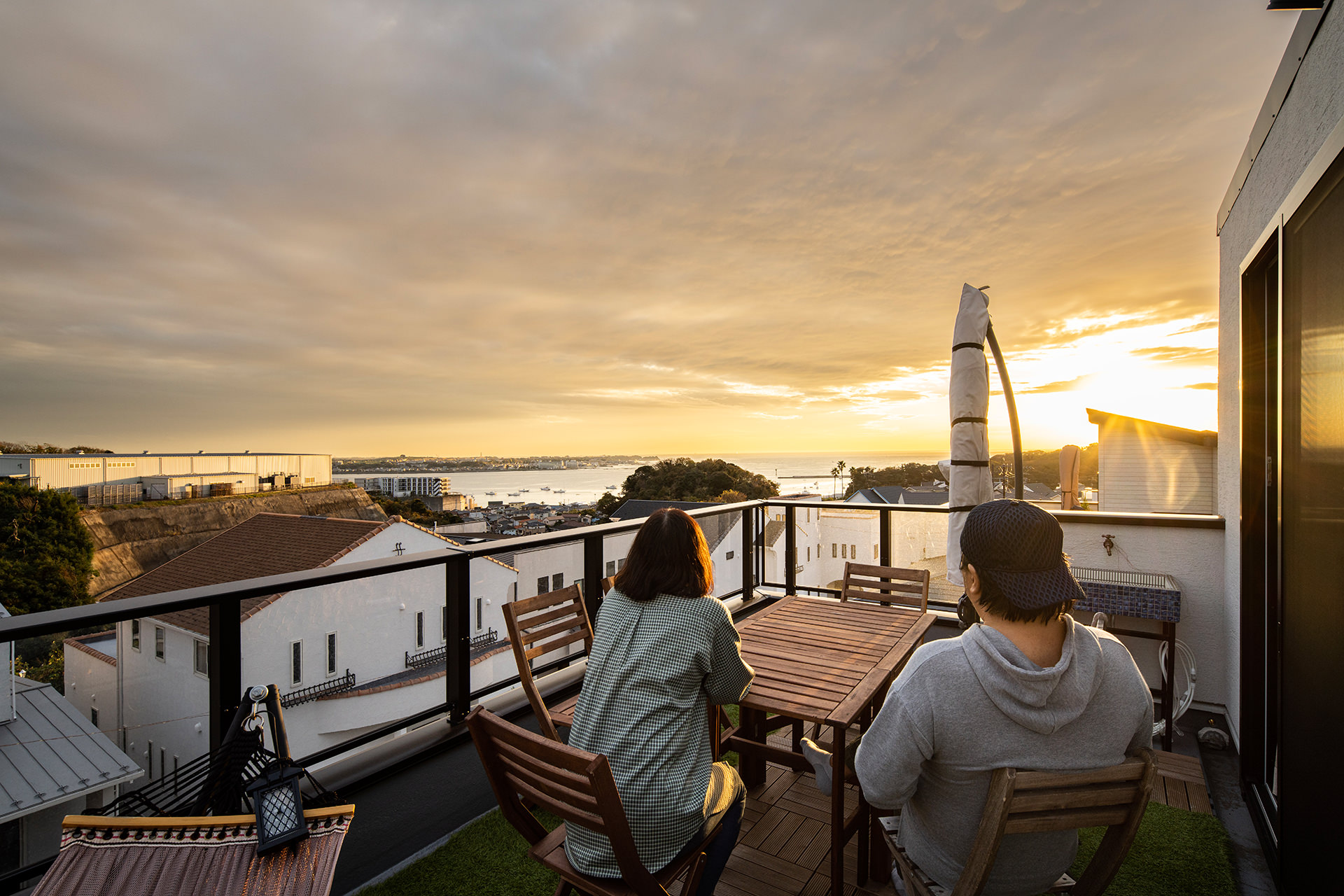 屋上からは、横須賀の海が一望でき、いつでも素晴らしい景色が楽しめます。平日の都会の喧騒をま擦れさせるような非日常的な時間を過ごすことができる、ご夫婦お気に入りのスペース。ゆったり、まったり、お気に入りの空間で贅沢な暮らしが実現できるお家になりました。