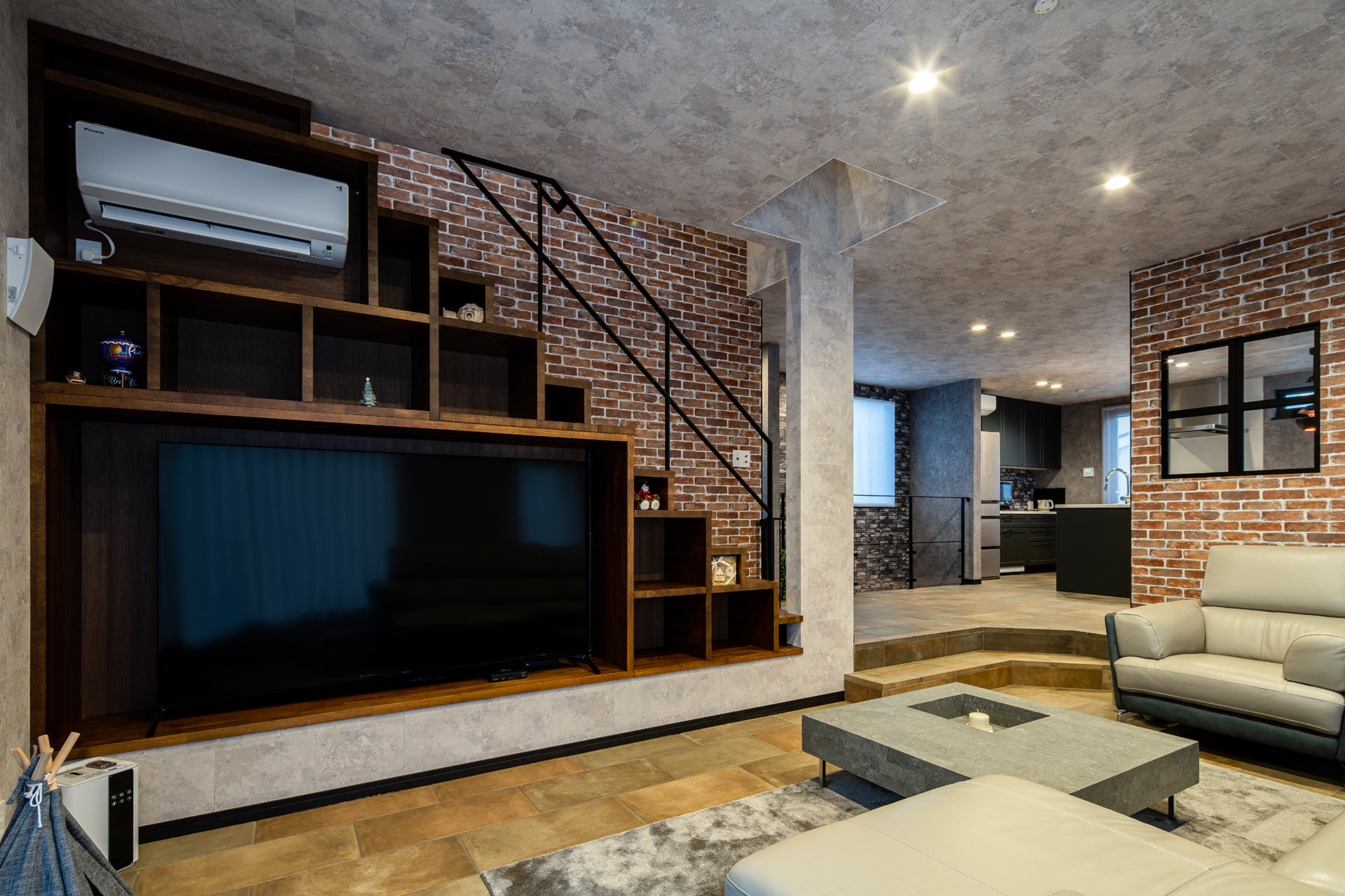 2階のダウンリビング。レンガ調のクロスがあたたかな空間です。