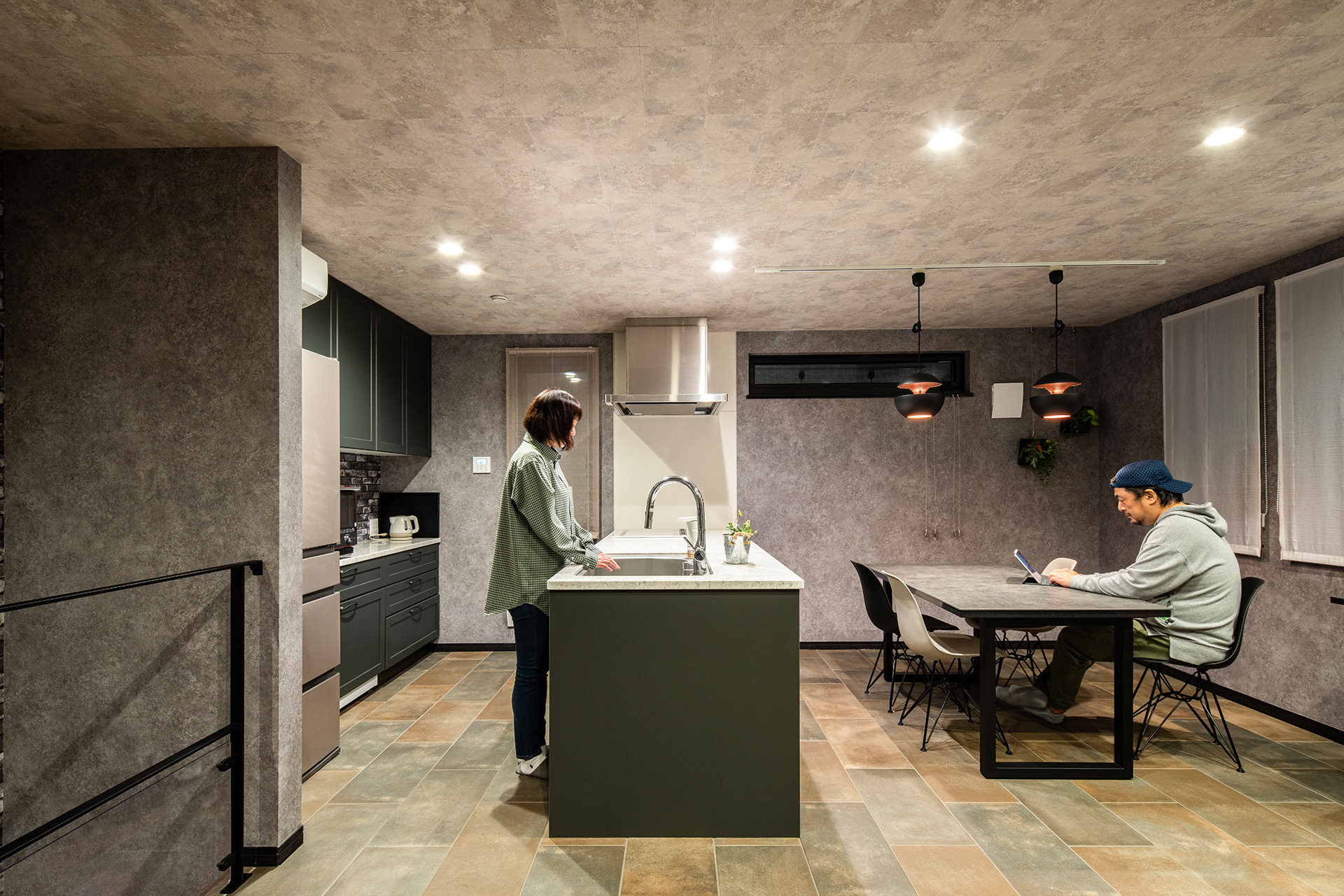 キッチンはモスグリーンでまとめたシックなデザイン。ご夫婦のセンスのある照明やインテリアでよりおしゃれな空間に仕上がりました