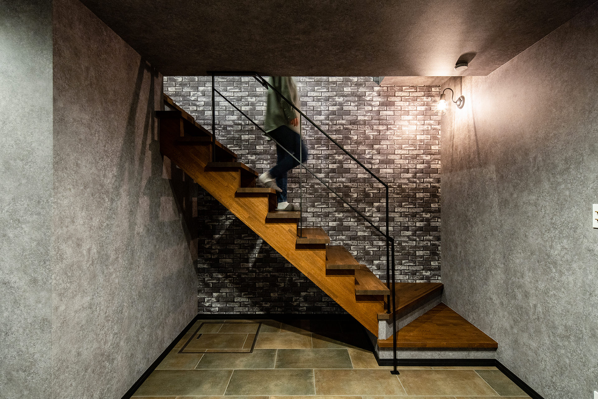 玄関を抜けた先にはリビングのある2Fのに上がる階段。床タイル、2種類のクロス、天井、階段の色、ライトに至るまで