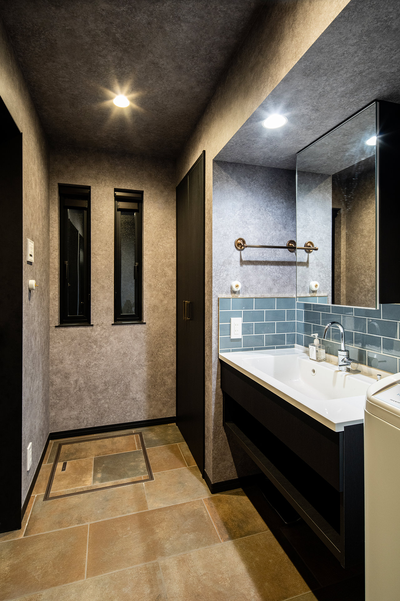 ブルーのタイルが爽やかな洗面スペース。横には収納を付けたので、すっきりと使えます。