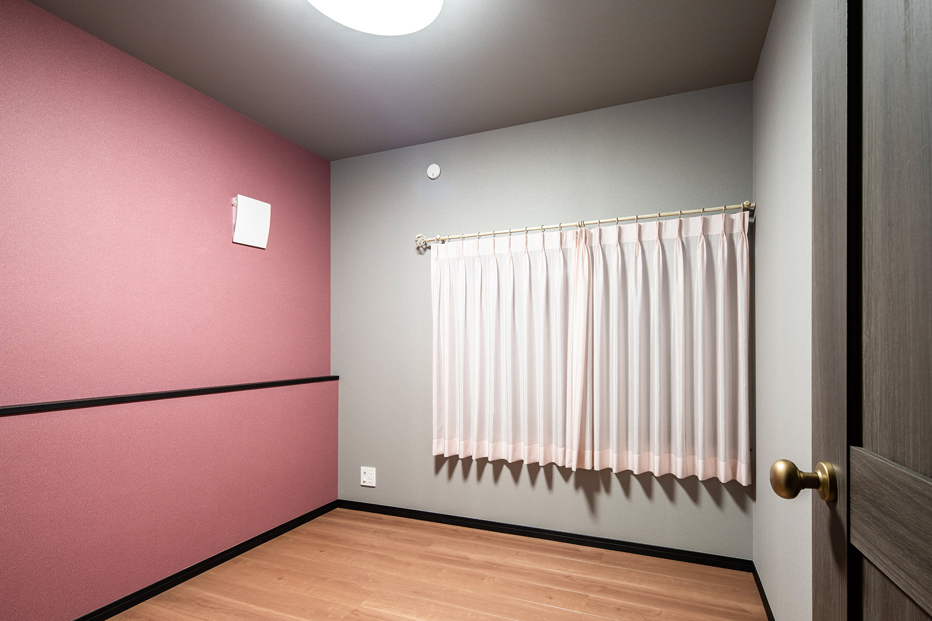 ピンクのクロスと落ち着いた風合いのフローリングがキュートな洋室。