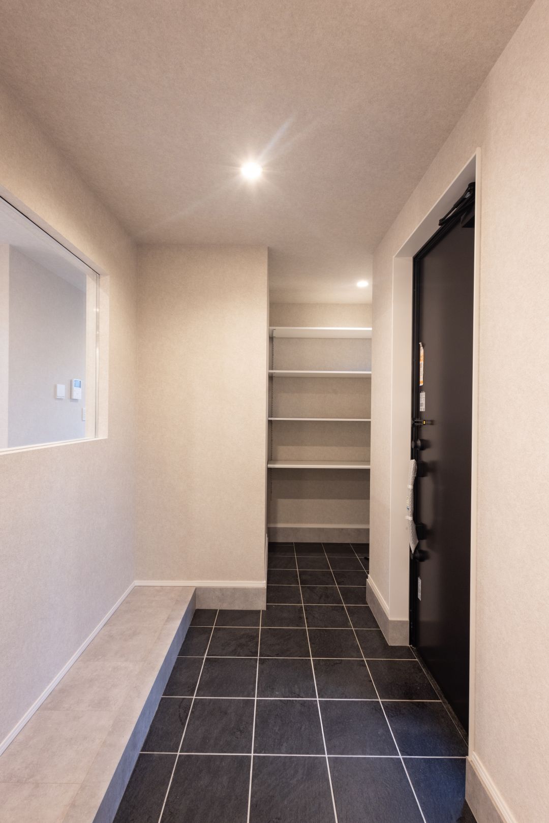 A棟・玄関/左側には腰掛、奥には大型のシューズクローク兼土間収納を設置。左のFIX室内窓の向こうはリビングなので、そちらから玄関の出入りが見えるようになっています